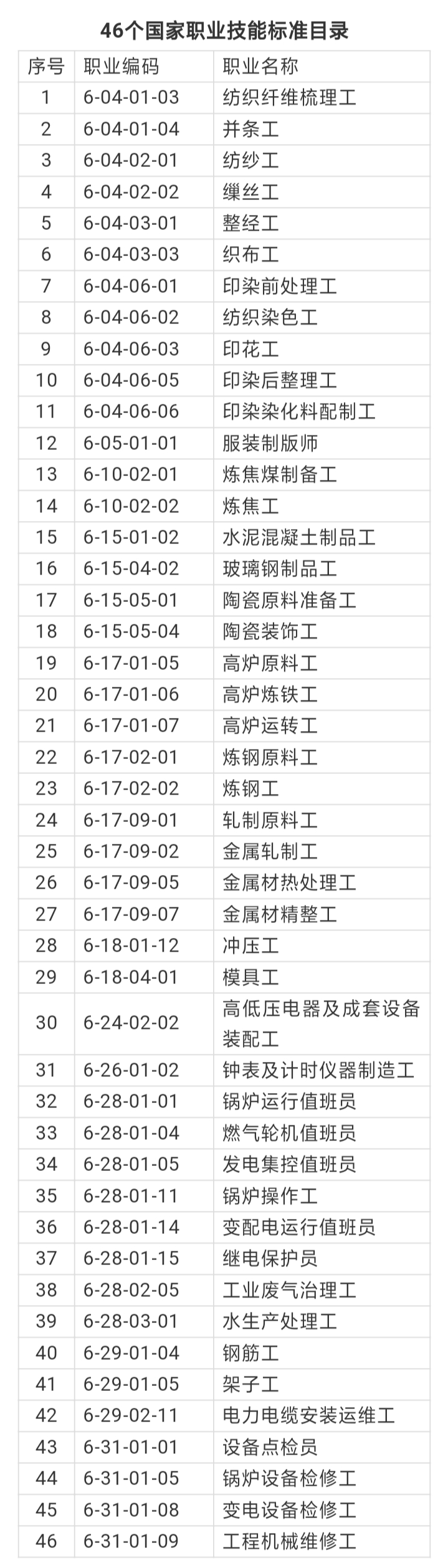近日,人力资源社会保障部颁布了纺织纤维梳理工等46个新版国家职业技能标准。此次颁布标准的46个职业,均属于《中华人民共和国职业分类大典(2015年版)》第六大类“生产制造及有关人员”,主要集中在纺织、轻工、印刷、冶金、机械、电力等生产制造领域。