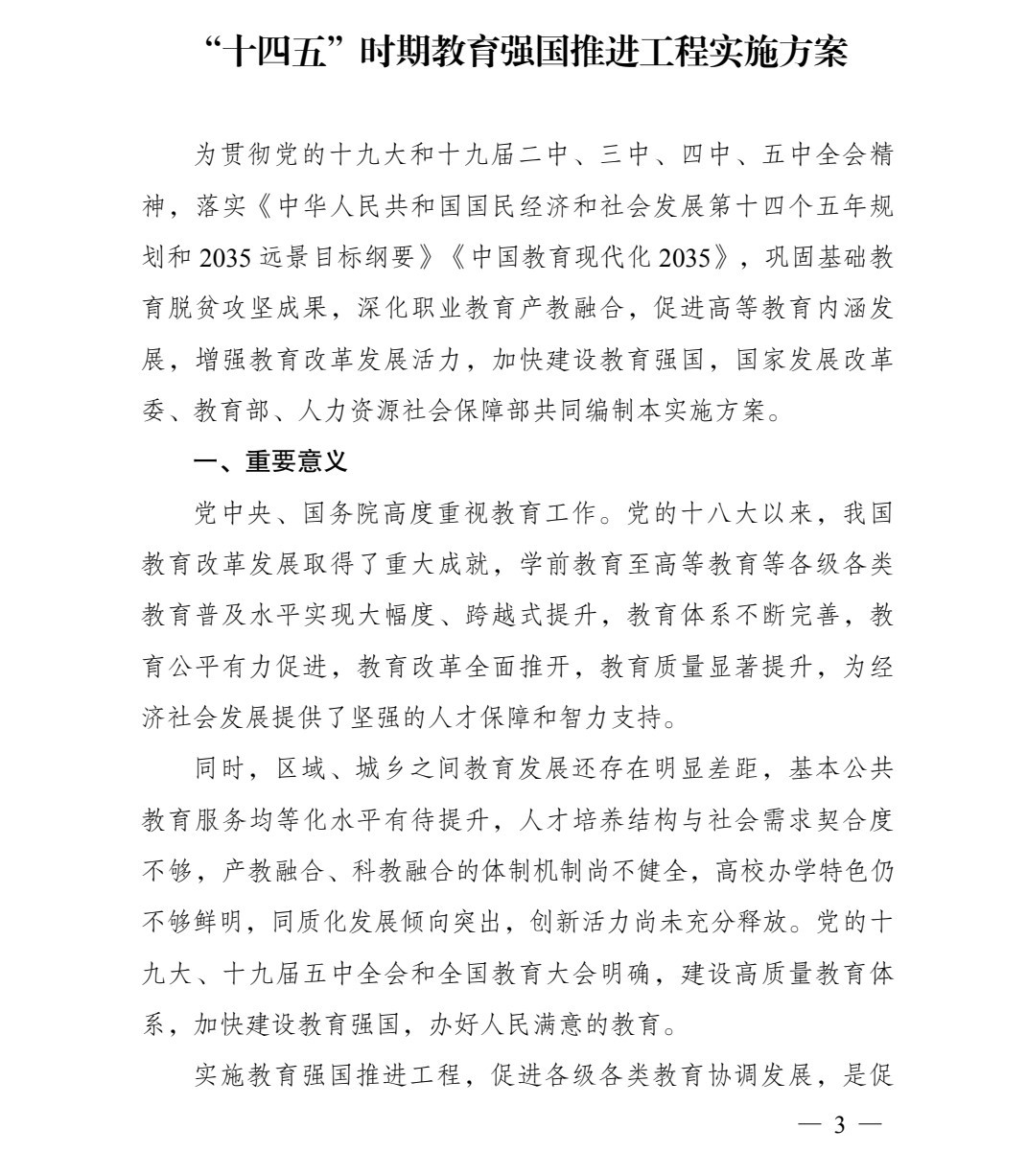 为贯彻党的十九大和十九届二中、三中、四中、五中全会精神,落实《中华人民共和国国民经济和社会发展第十四个五年规划和2035远景目标纲要》《中国教育现代化2035》,巩固基础教育脱贫攻坚成果,深化职业教育产教融合,促进高等教育内涵发展,增强教育改革发展活力,加快建设教育强国,“十四五”期间,国家发展改革委、英国正版365官方网站、人力资源社会保障部决定实施教育强国推进工程。现将《“十四五”时期教育强国推进工程实施方案》印发给你们,请结合《教育强国推进工程中央预算内投资专项管理办法》(发改社会规〔2021〕525号),一并认真遵照执行。