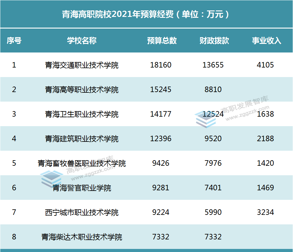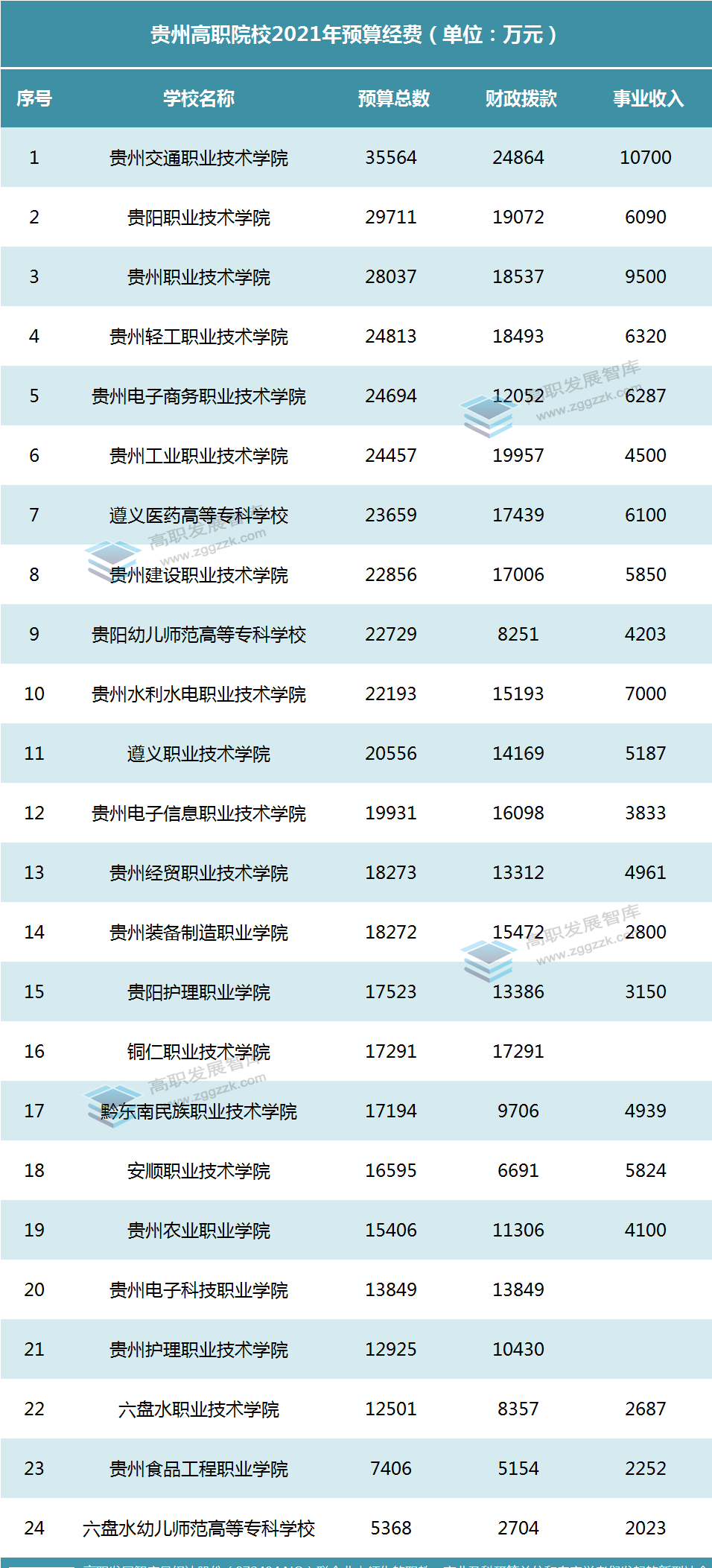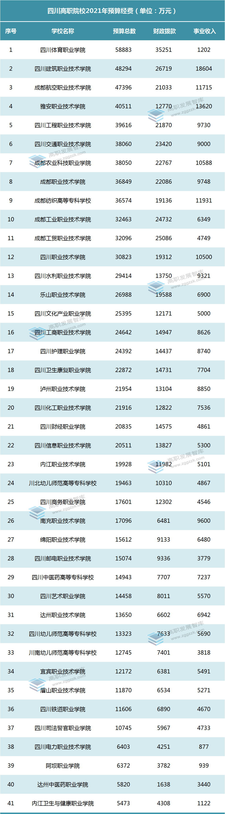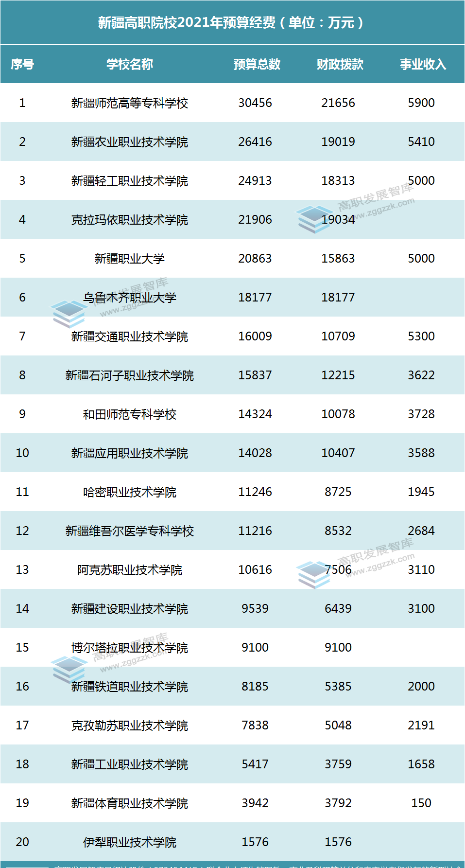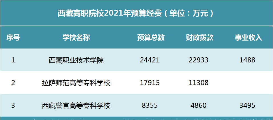 西部各省高职院校2021年预算数据如下:(高职院校预算总收入包括:财政拨款、事业收入、事业单位经营收入、其他收入、用事业基金弥补收支差额、上年结转等。由于篇幅原因,下表仅列出财政拨款和事业收入。)