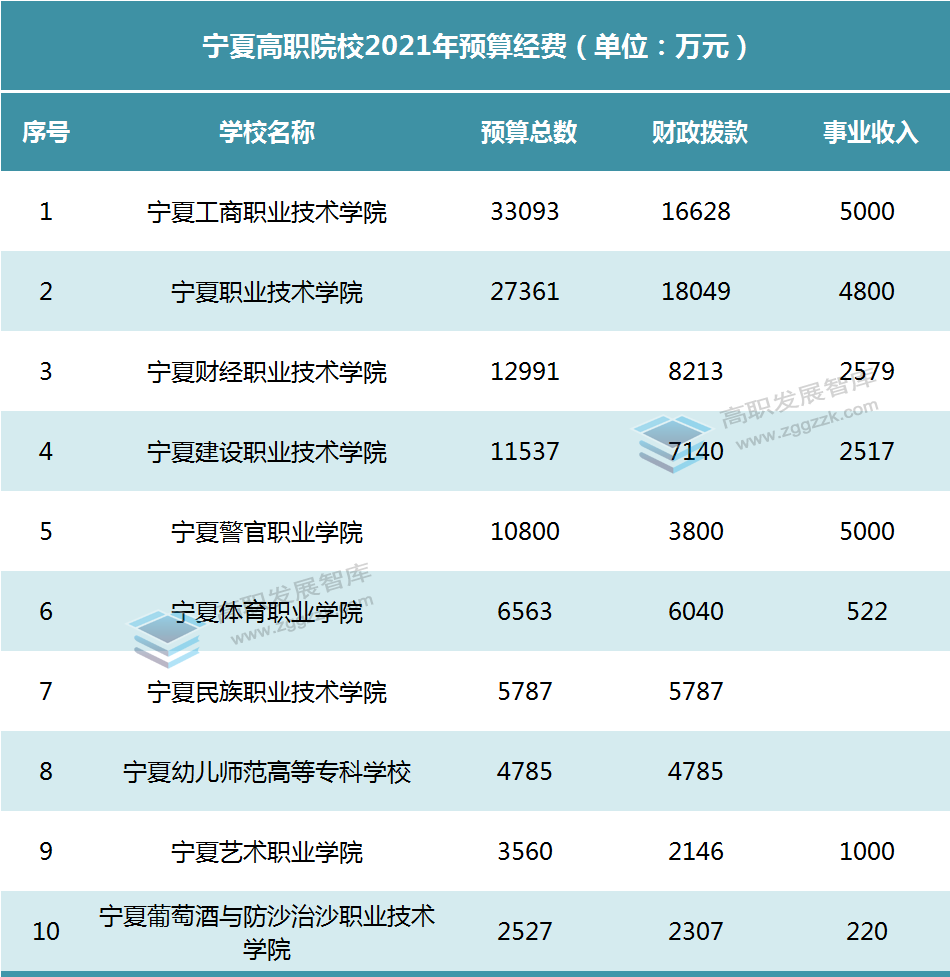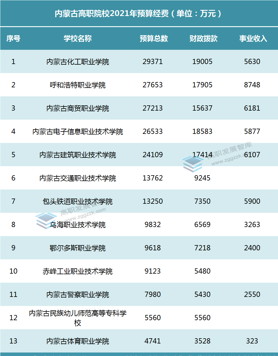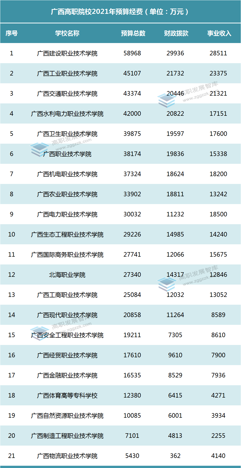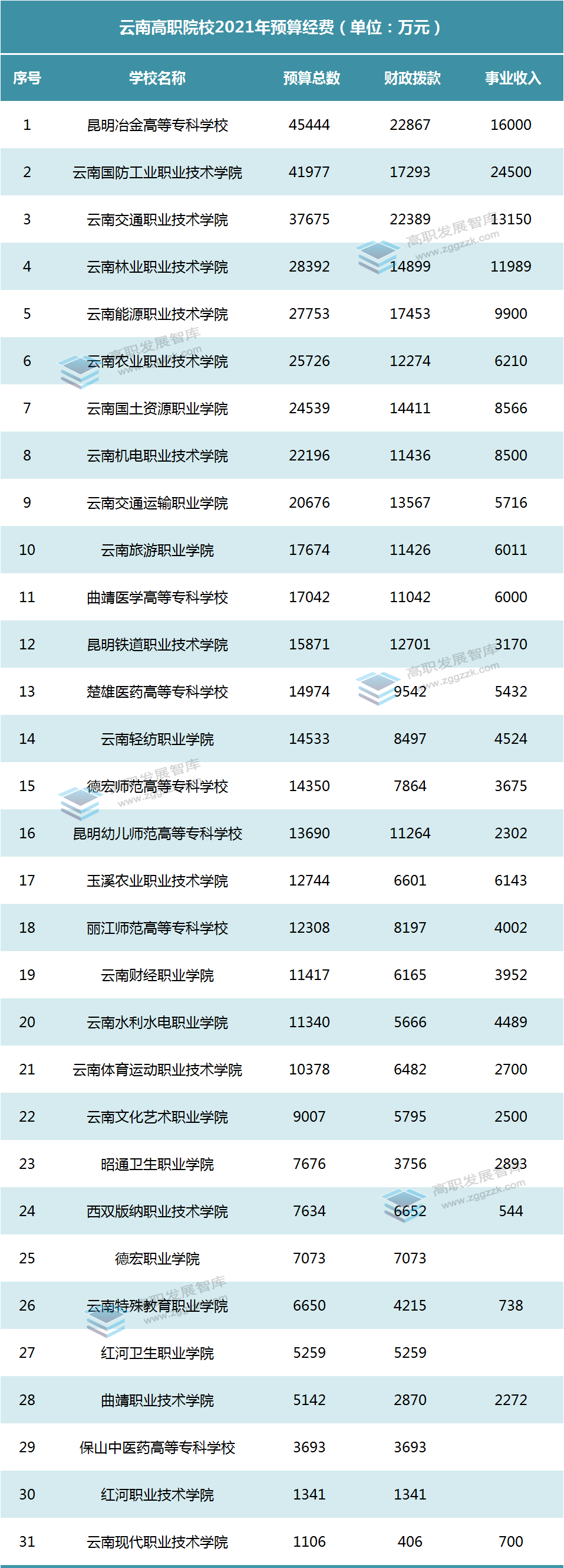 西部各省高职院校2021年预算数据如下:(高职院校预算总收入包括:财政拨款、事业收入、事业单位经营收入、其他收入、用事业基金弥补收支差额、上年结转等。由于篇幅原因,下表仅列出财政拨款和事业收入。)