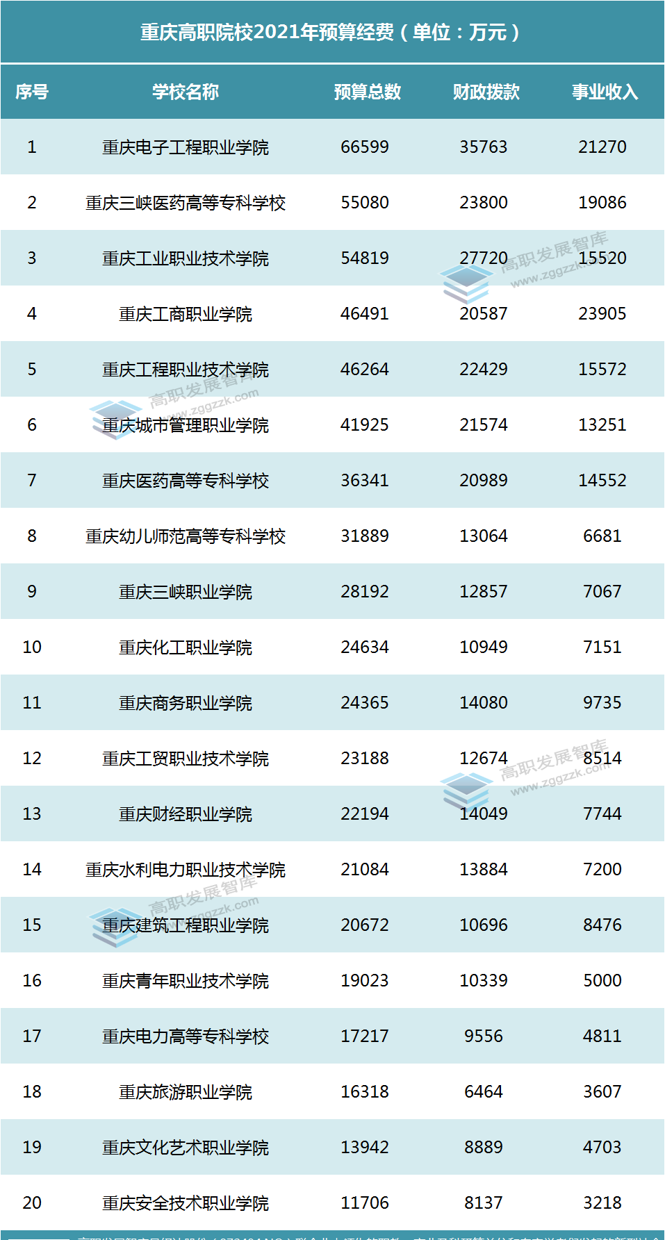 重庆电子工程职业学院2021年总预算为66599万元,位居西部第二位;陕西青年职业学院以63496万元位居西部第三。
