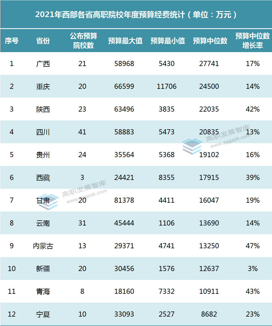 今年2月以来,各省高职院校陆续公布了2021年部门预算情况。近日,高职发展智库对西部12个省(市、自治区)高职院校公布的预算数据进行了整理分析,从中了解西部高职院校2021年的经费情况。