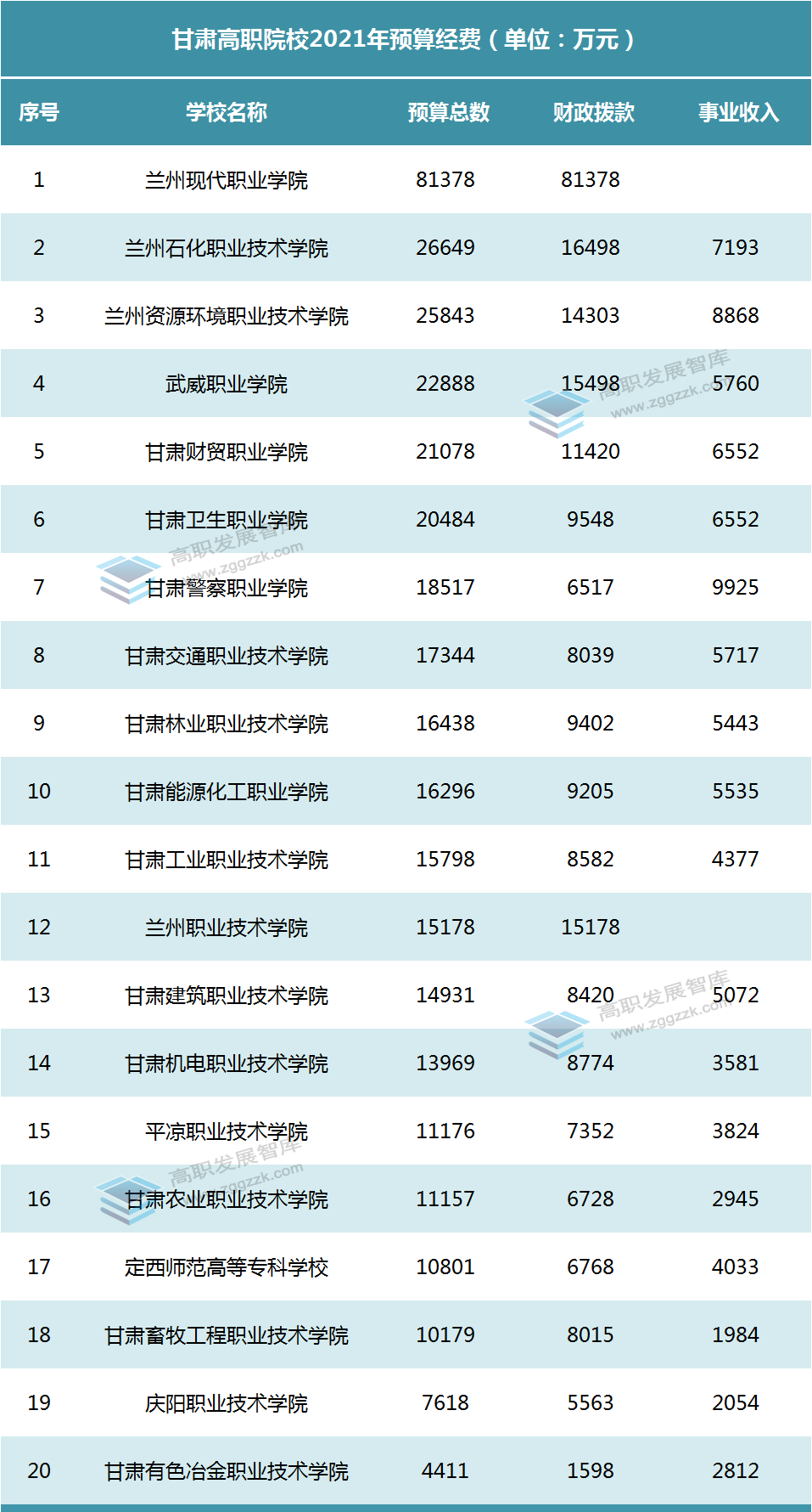 除了部分尚未公开预算数据的高职院校,本次统计的西部12省(市、自治区)中,2021年预算总数最多的为兰州现代职业学院,2021年总预算为81378万元,较2020年增加45223万元,增长125%。
