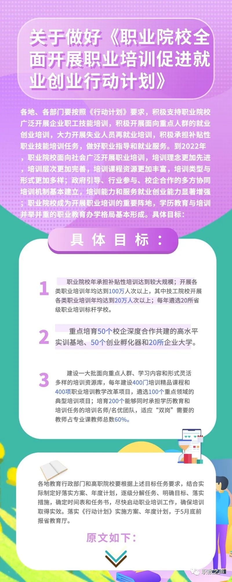 各地、各部门要按照《行动计划》要求,积极支持职业院校广泛开展企业职工技能培训,积极开展面向重点人群的就业创业培训,大力开展失业人员再就业培训,积极承担补贴性职业技能培训任务,做好职业指导和就业服务。到2022年,职业院校面向社会广泛开展职业培训,培训理念更加先进,培训层次更加完善,培训课程资源更加丰富,培训类型与形式更加多样;政府引导、行业参与、校企合作的多方协同培训机制基本建立,培训能力和服务就业创业能力显著增强;职业院校成为开展职业培训的重要阵地,学历教育与培训并举并重的职业教育办学格局基本形成。具体目标: