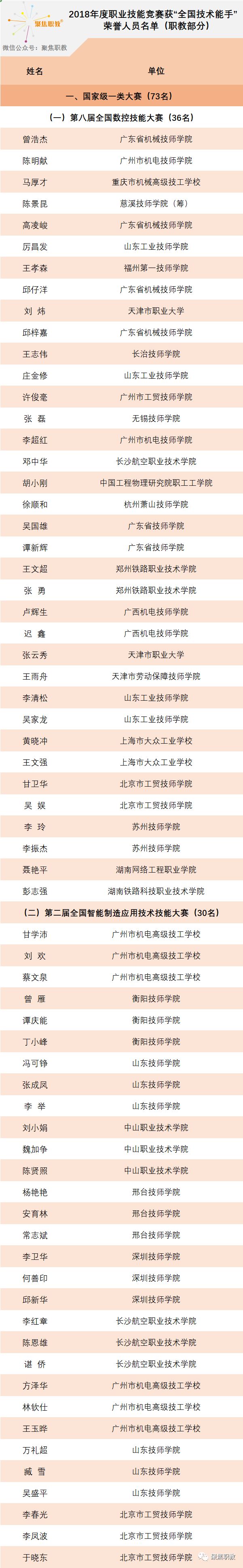 近日,人社部公示了第45届世界技能大赛全国选拔赛获“全国技术能手”荣誉人员名单、2018年度职业技能竞赛获“全国技术能手”荣誉人员名单。