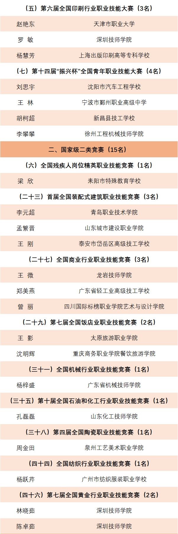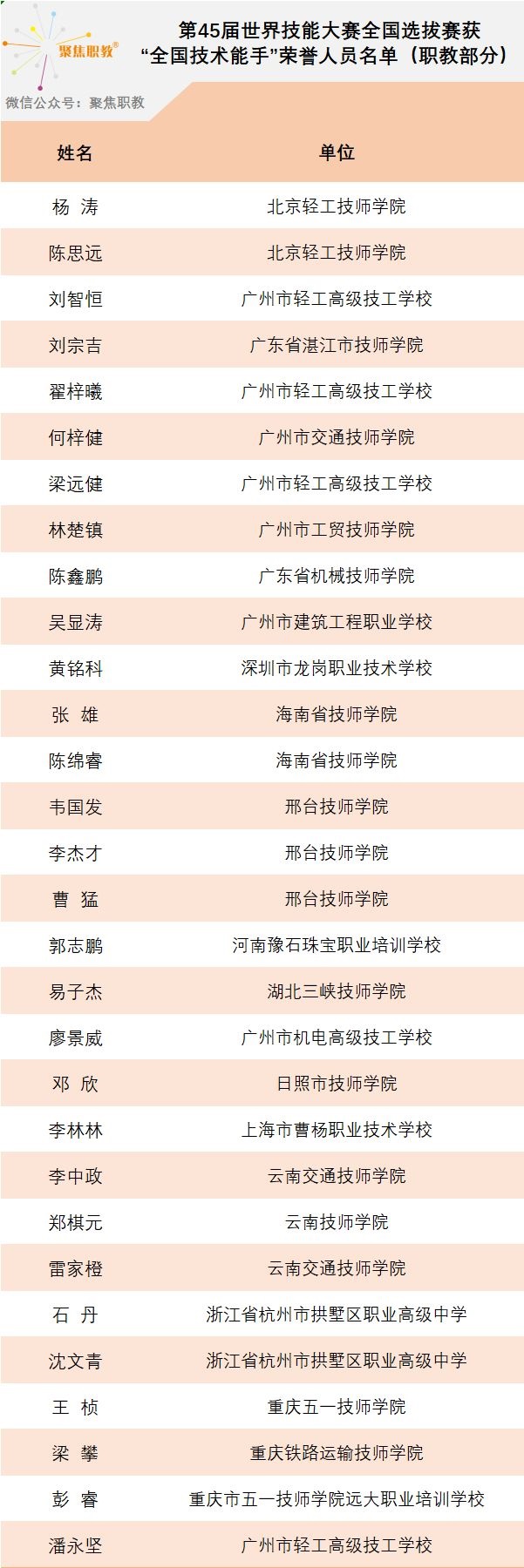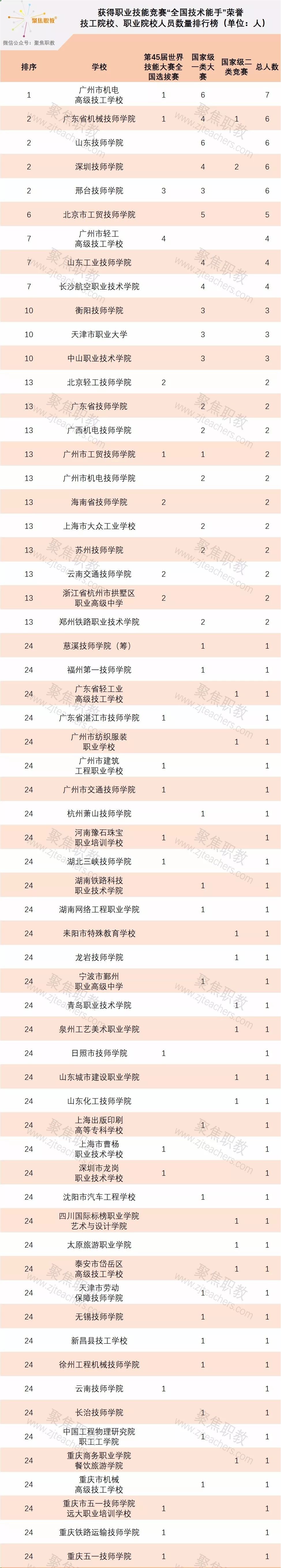 聚焦职教对职教领域的选手名单进行统计,得出获得职业技能竞赛“全国技术能手”荣誉的技工院校、职业院校人员数量排行榜。