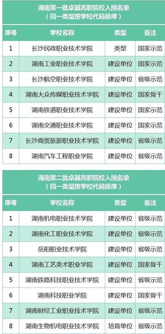 经专家评审、评审委员会审议,湖南商务职业技术学院、湖南环境生物职业技术学院、湖南城建职业技术学院、湖南高速铁路职业技术学院入围第三批卓越高职院校建设单位名单;湖南中医药高等专科学校入围卓越高职院校培育单位名单。