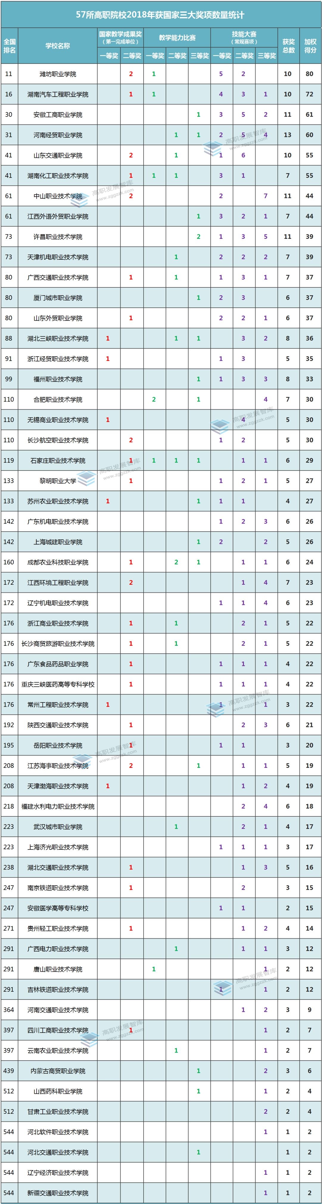 今年1月,高职发展智库对2018年国家教学成果奖、职业院校教学能力比赛和全国职业院校技能大赛这三大重量级奖项进行了统计分析(年终盘点 | 2018年高职教育国家三大奖项数量统计,哪些高职院校表现突出?)。从统计结果来看,这57所高职院校中,有16所院校进入了百强。