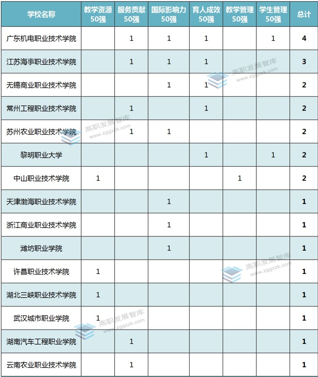 从统计结果来看,这57所高职院校中,有15所院校上榜以上六大“50强”榜单。其中,广东机电职业技术学院上榜4个“50强”榜单,江苏海事职业技术学院上榜3个“50强”榜单,表现非常亮眼。