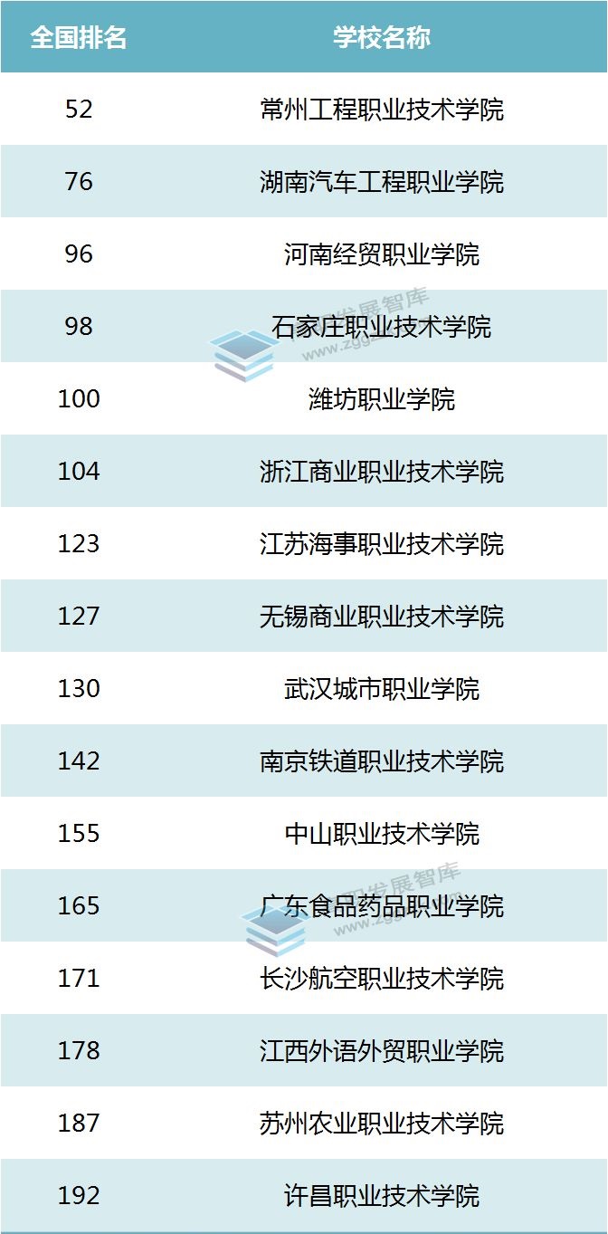 排行榜也是评价学校办学成就的重要参考指标之一,在2019年中国高职高专院校综合竞争力排行榜中,这57所高职院校,有16所进入了前200名。其中,常州工程职业技术学院、湖南汽车工程职业学院、河南经贸职业学院、石家庄职业技术学院、潍坊职业学院等5所院校在众多高职院校中脱颖而出,跻身全国百强之列。