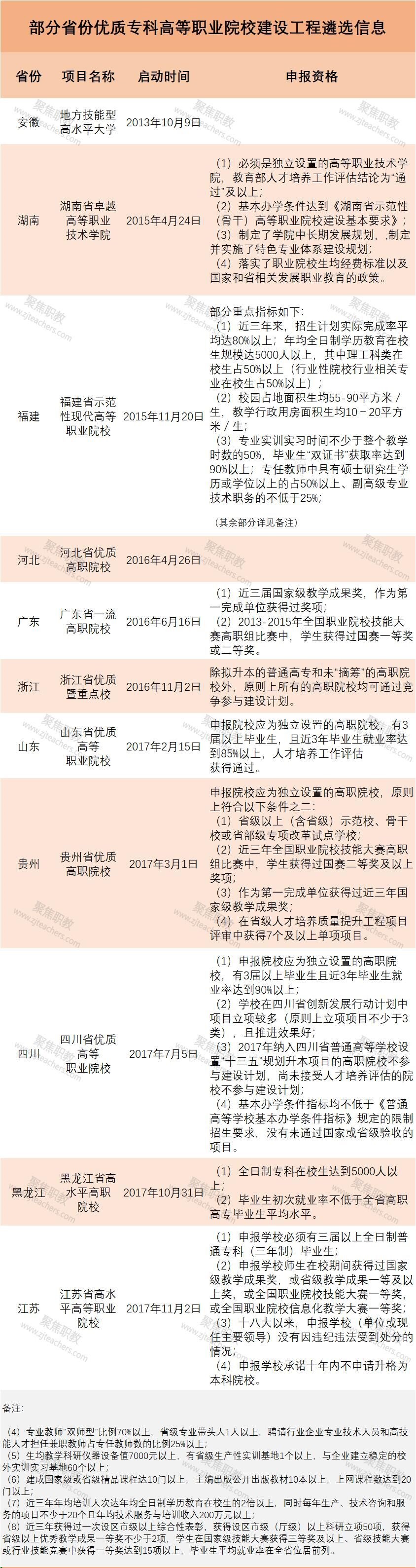 中国特色高水平高职学校第一轮建设的遴选管理方法中明确提出,学校需已被确定为《高等职业教育创新发展行动计划(2015—2018年)》省级及以上优质高职学校建设单位。事实上,这意味着,在全国范围内,已有456所优质职校拿到入场券(其中已公布437所职校名称),有望成为五十分之一,承担起为职教领域“双一流”工程探路的历史重任。