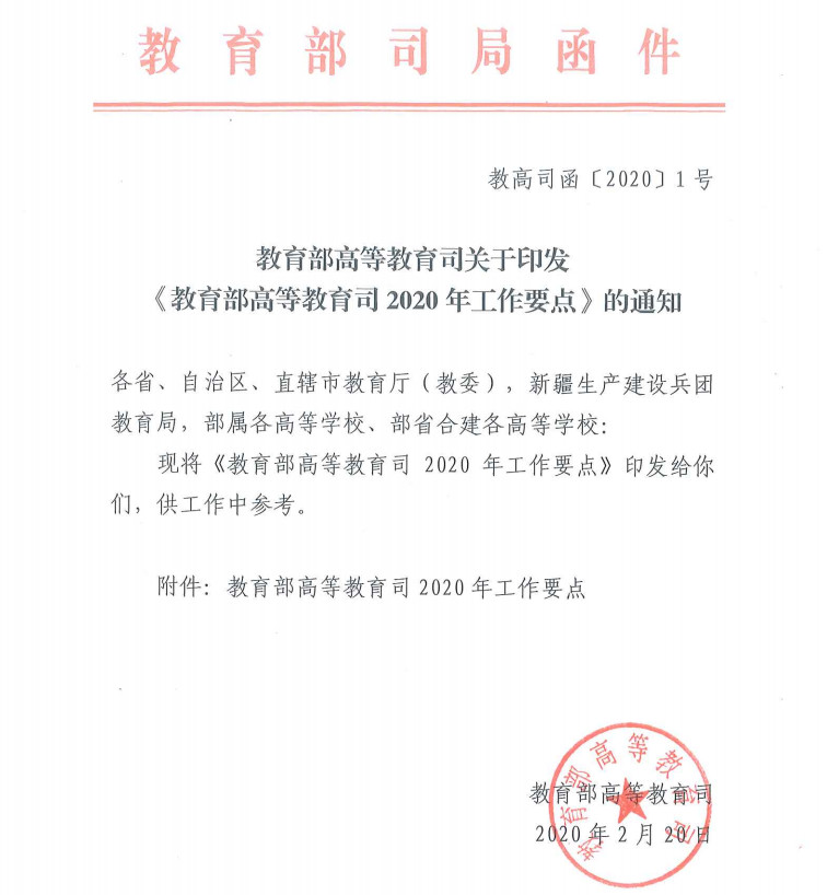 召开2020年高教(厅)处长会。全面部署年度工作,指导各地各高校深入实施振兴本科教育行动方案,持续推进“以本为本”“四个回归”,加强从严管理、从严治教,合力推进全面振兴本科教育“三部曲”。部署指导各地教育行政部门按照高教法执法检查报告要求,持续抓好改进落实工作。