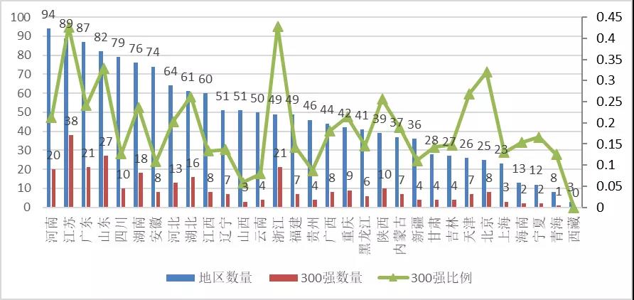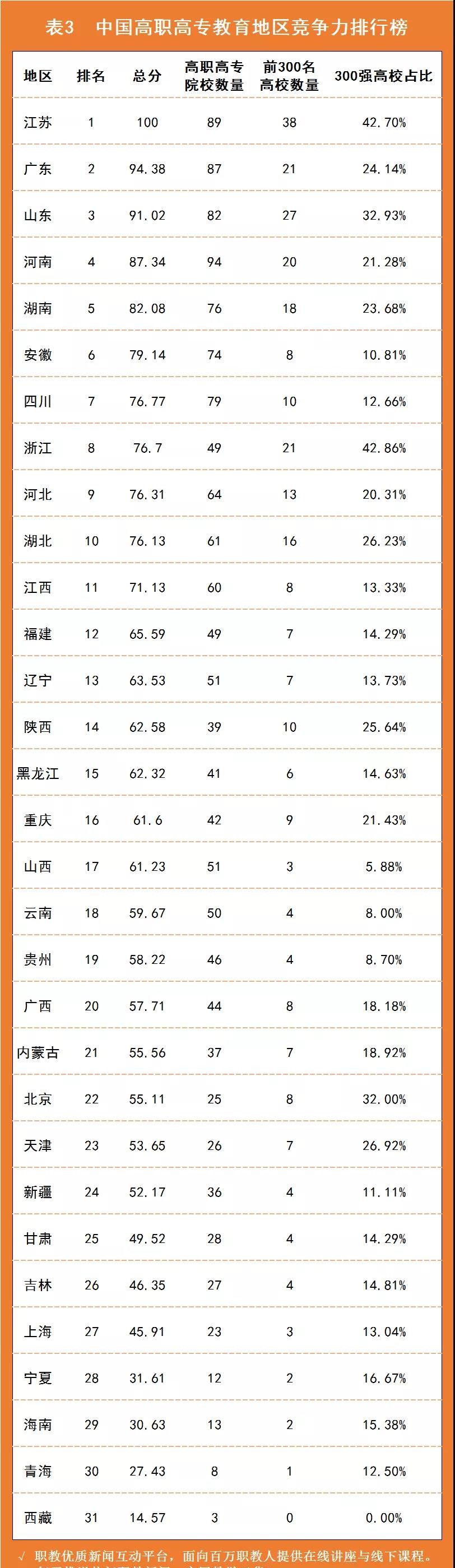 高职排名300强中,江苏占38所有明显优势,山东27所、广东和浙江各21所、河南20所依次进入前五位;