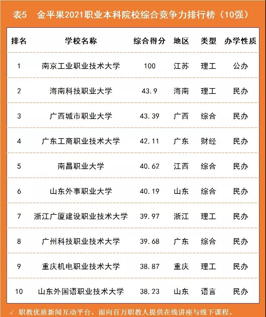 金平果2021职业本科院校综合竞争力排行榜(10强)