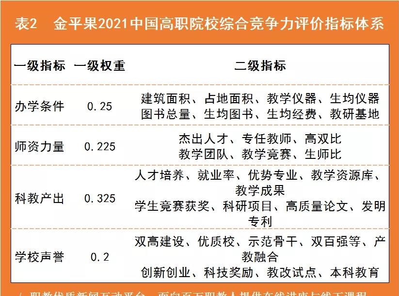 表2 金平果2021中国高职院校综合竞争力评价指标体系