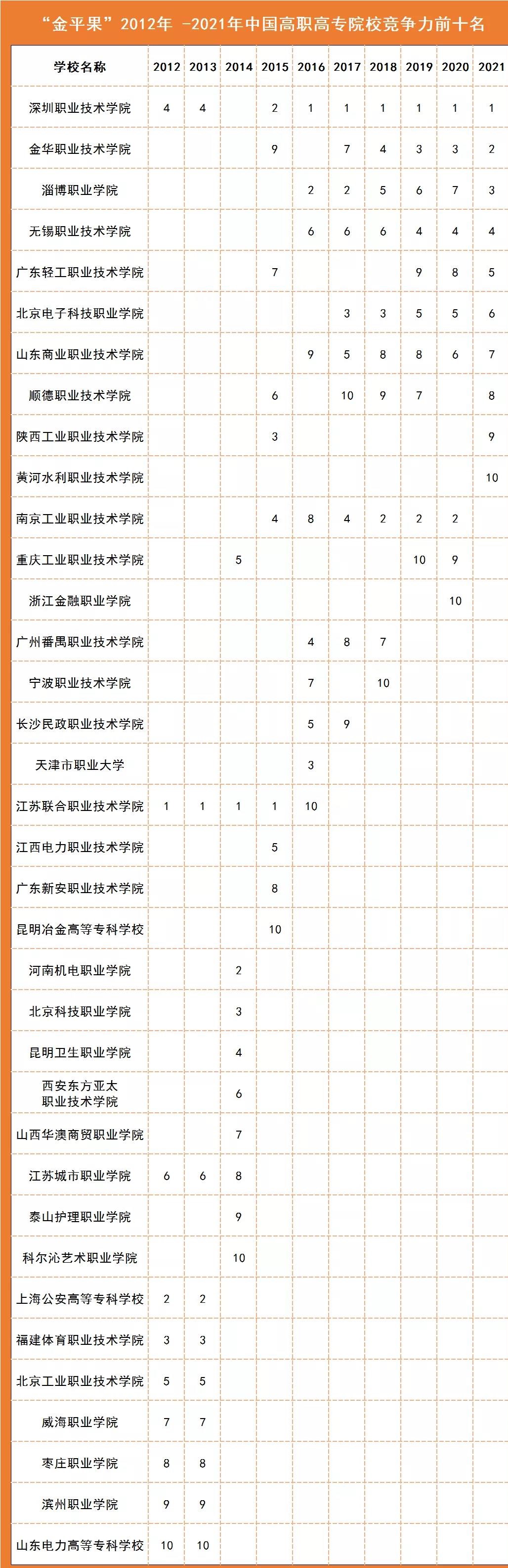 从2012年到2021年,“金平果”连续十年推出中国高职院校竞争力排行榜,聚焦职教在此特别为大家呈现这十年间,每一年高职高专竞争力排行榜前十名的院校。
