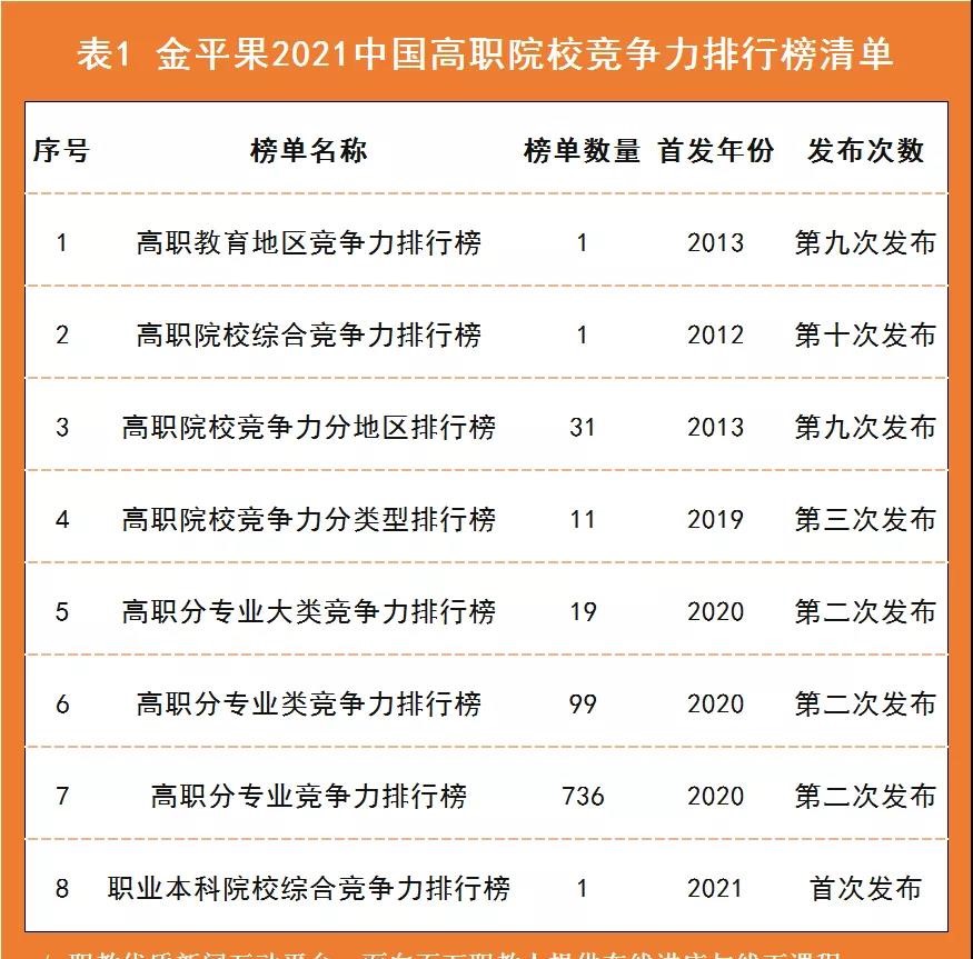 2021年3月,“金平果”连续第十次推出中国高职院校竞争力排行榜,今年首次推出职业本科院校排名,同时将继续发布高职专业评价结果,2021版高职评价将陆续发布近900个排行榜单。