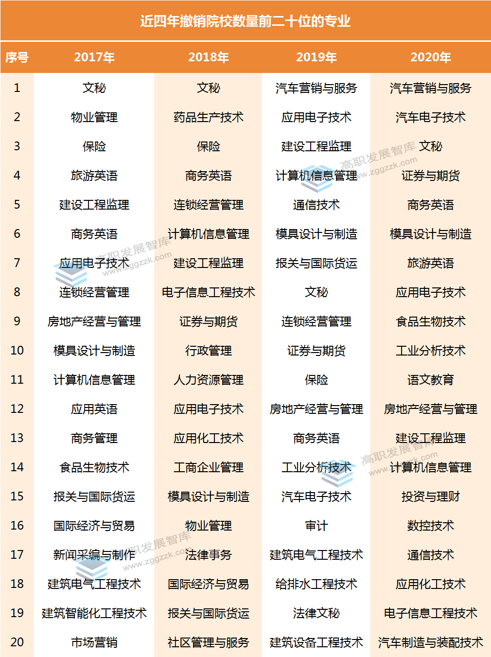 2017年至2020年,撤销备案专业TOP20中,四年均上榜的专业有:文秘、应用电子技术、建设工程监理、商务英语、计算机信息管理、模具设计与制造。而汽车营销与服务专业2019年、2020年连续两年位居撤销榜榜首。专业撤销的原因是多方面的,但总体而言与专业不符合社会发展和市场需要,专业重置率高以及生源等因素有关。一些曾经热门的专业被撤销,折射出一些高职院校在设置专业时,忽视学校办学定位、盲目追赶时髦、追求专业设置大而全的问题。