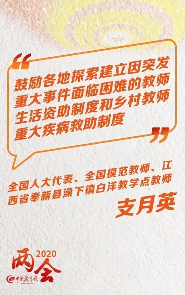 全国人大代表、全国模范教师、江西省奉新县澡下镇白洋教学点教师支月英建议,提高乡村教师生活待遇。确保平均工资收入水平不低于或高于当地公务员平均工资收入水平。完善绩效工资政策,在核定绩效工资时,对乡村小规模学校、寄宿制学校、民族地区、艰苦边远地区学校给予适当倾斜;支持各地因地制宜调整绩效工资结构,合理确定奖励性绩效工资占比。