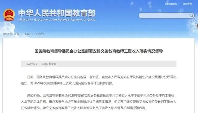 此前,国务院教育督导委员会办公室发出通知,对2020年义务教育教师工资收入落实情况督导作出具体安排。通知明确,此次督导主要围绕2020年底前实现义务教育教师平均工资收入水平不低于当地公务员平均工资收入水平的总体目标,重点考察各地近三年来推进总体目标落实情况,相关部门建立保障义务教育阶段教师工资收入长效机制情况,建立义务教育教师工资收入随当地公务员工资收入动态调整机制情况等内容。