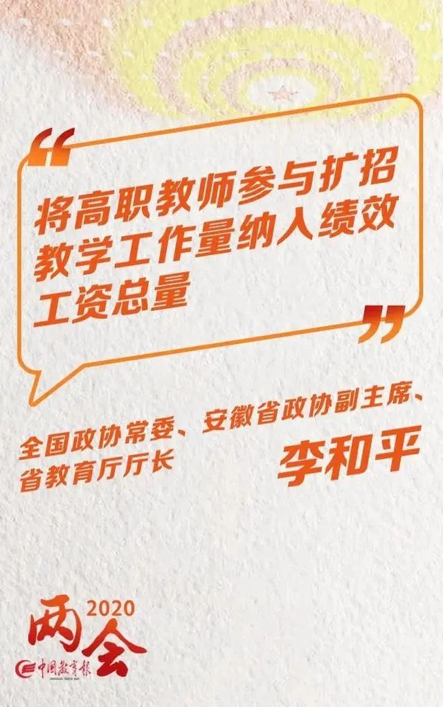 全国政协常委、安徽省政协副主席、省教育厅厅长李和平建议,国家要进一步深化高职教育经费投入机制改革,加大对高职教育的投入,建立与办学规模、培养成本、办学质量等相适应的财政投入制度。进一步建立健全高职教育标准体系,进一步完善相关评估评价体系。进一步落实相关配套支持政策,国家相关部门尽快出台政策,进一步完善教师绩效工资核定办法,将教师参与扩招教学工作量纳入绩效工资总量,以保障高职院校扩招后教师动力不减,教学标准不降。