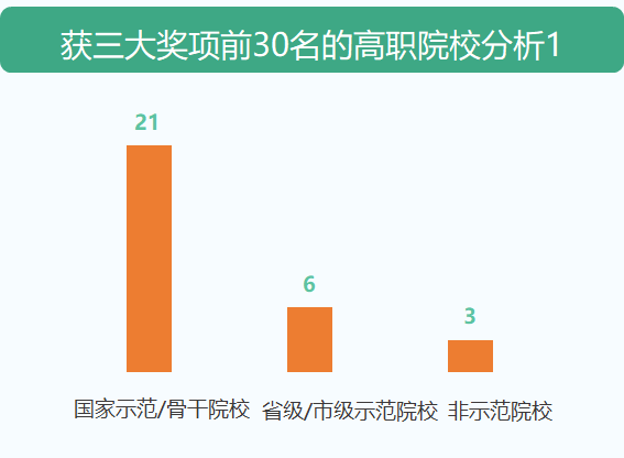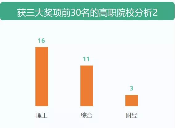 当然,这三大奖项获奖对于理工类高职院校有优势,获三大奖项前30名的高职院校中,理工类院校16所,综合类院校11所,财经类院校3所。