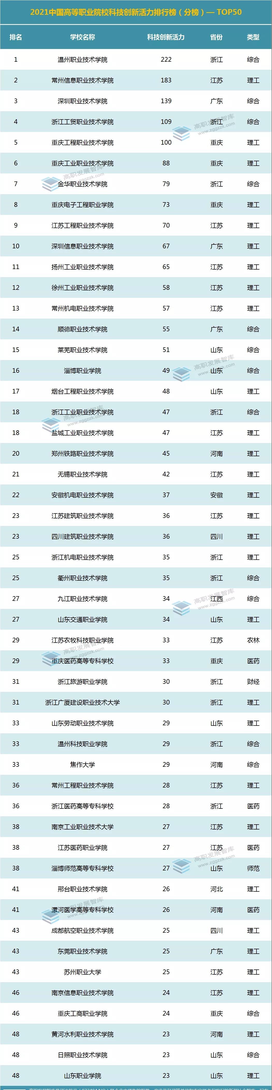 “科技创新活力”:温州职业技术学院、常州信息职业技术学院、深圳职业技术学院位列前三。