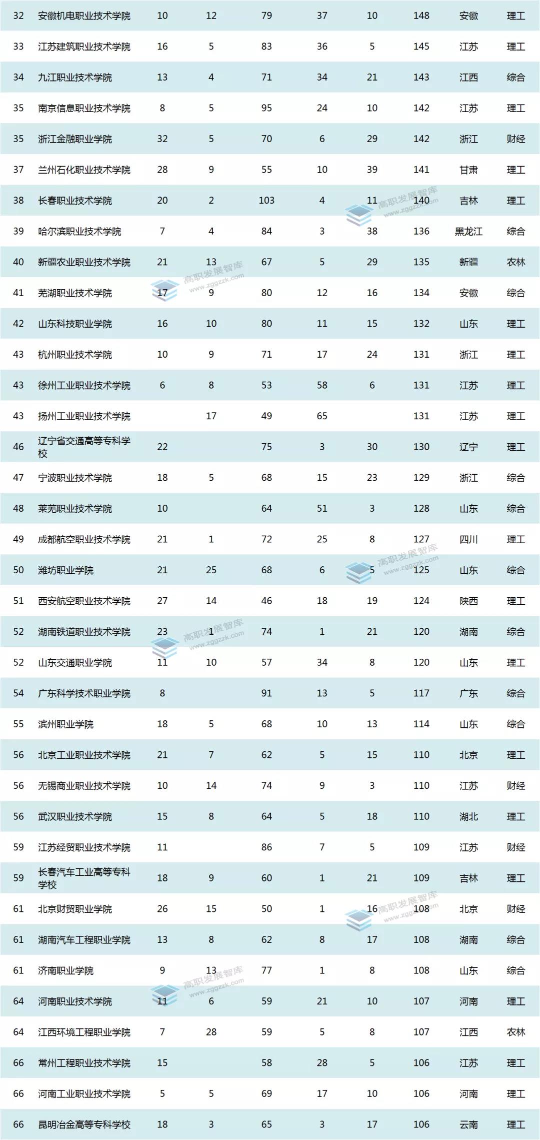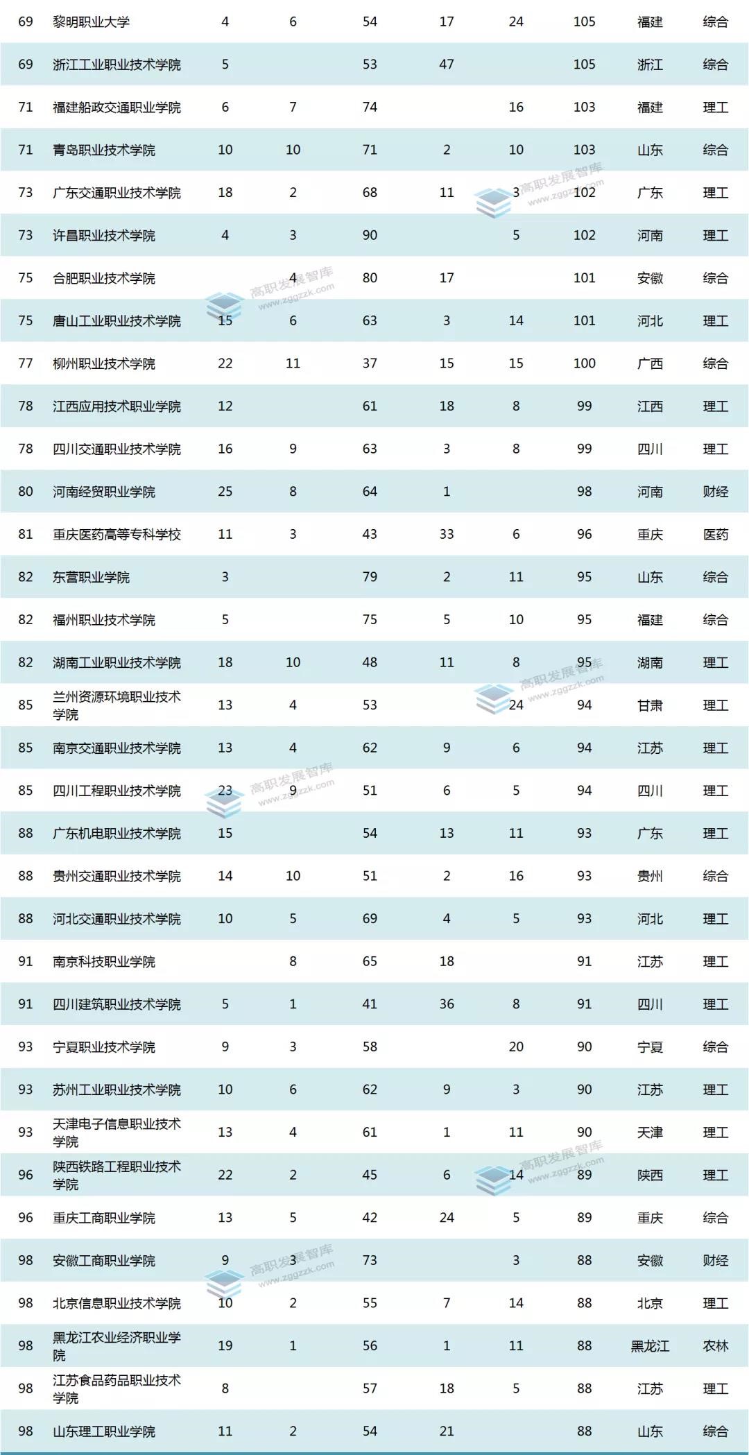 总榜百强中,东部院校60所,中部院校22所,西部院校20所。以江苏(18所)、山东(12所)、广东(8所)、浙江(8所)为代表的东部及沿海地区依旧是全国高等职业教育改革的最前沿,改革力度大,改革成绩突出且远优于中西部。