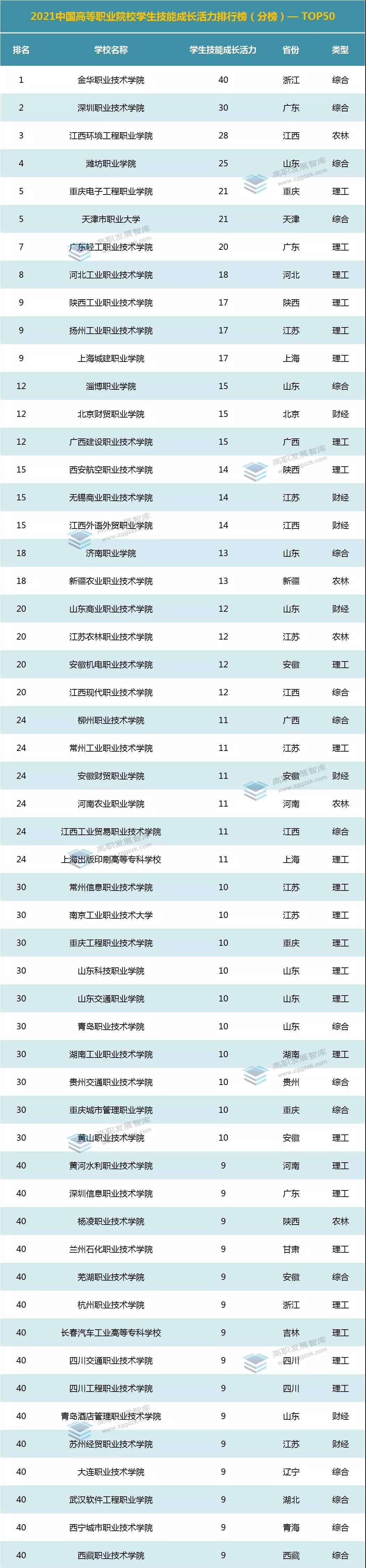 “学生技能成长活力”:金华职业技术学院、深圳职业技术学院、江西环境工程职业学院位列前三。