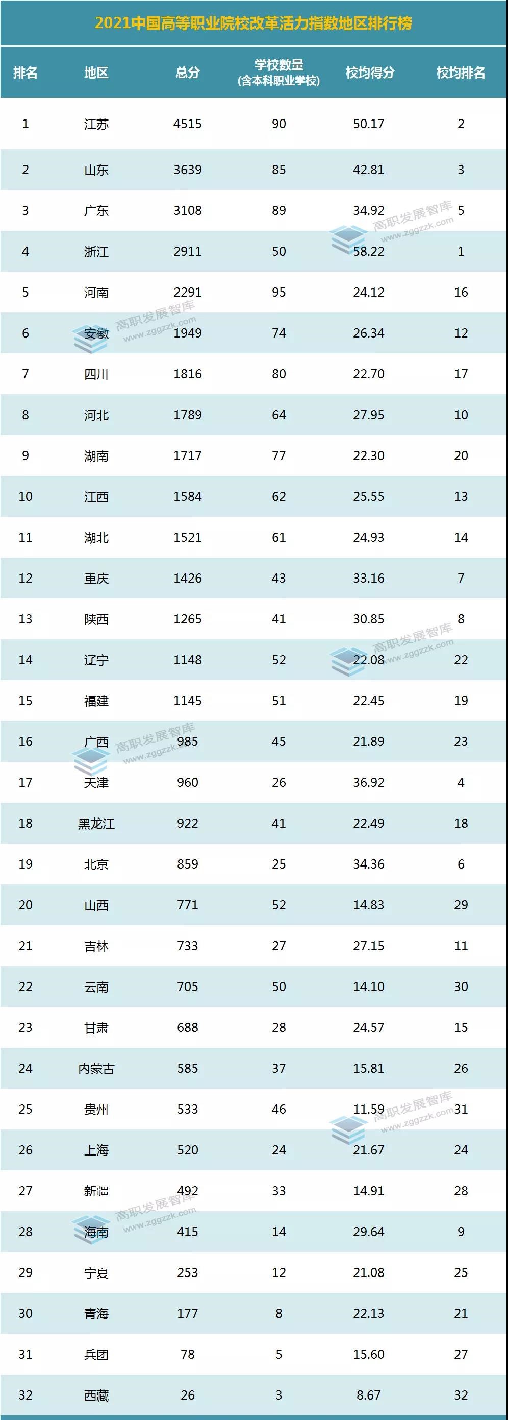 从改革活力指数地区排行榜来看,江苏、山东、广东延续去年优势,稳居前三位;从校均得分来看,浙江、江苏、山东、天津、广东等省高等职业院校平均实力较强。