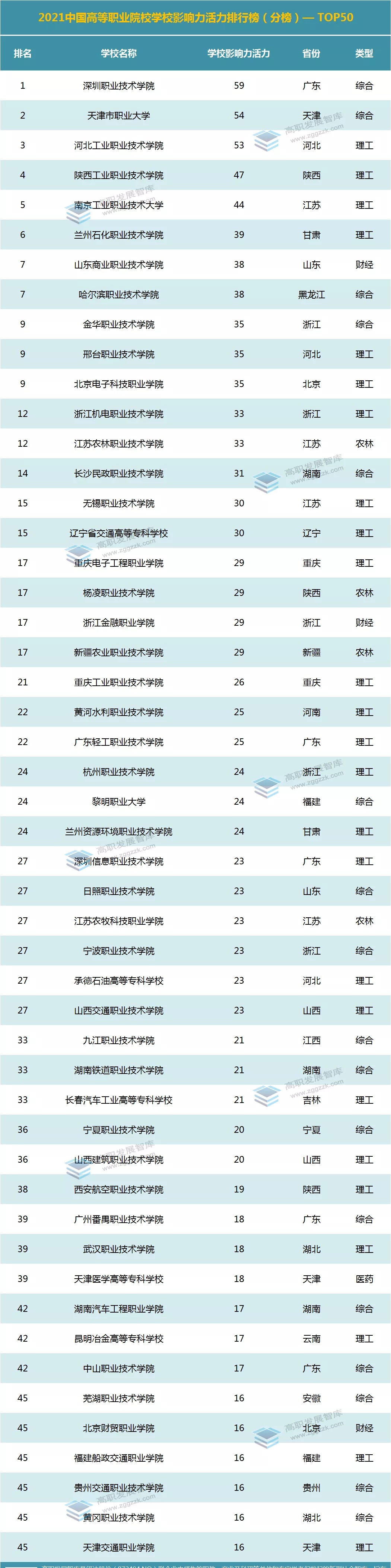 “学校影响力活力”:深圳职业技术学院、天津市职业大学、河北工业职业技术学院位列前三。