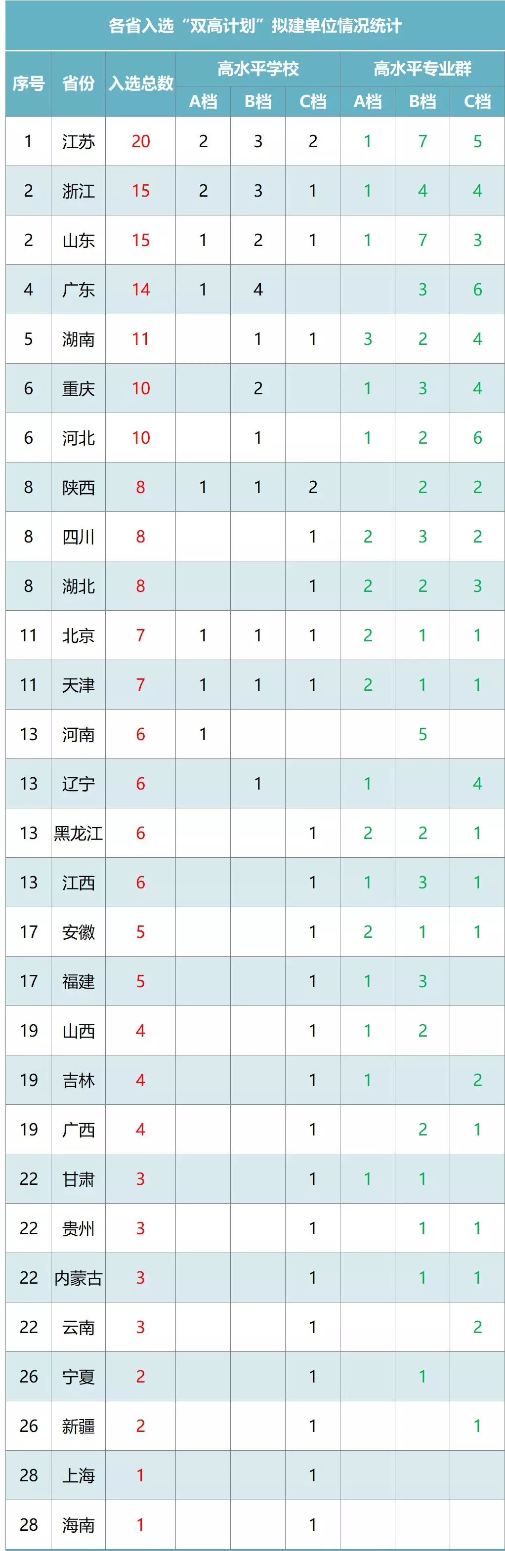 以下是各省入选“双高计划”拟建单位情况统计