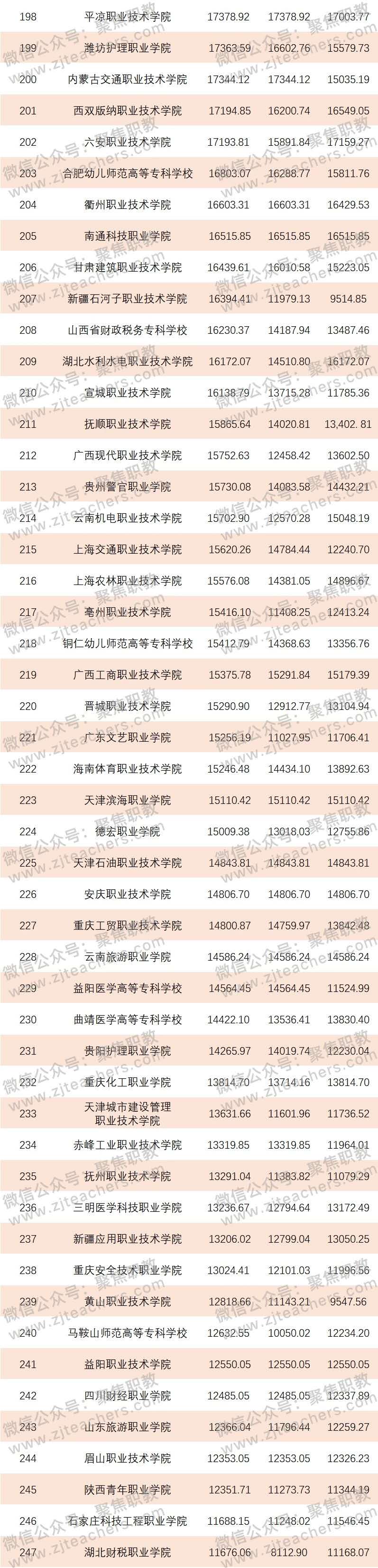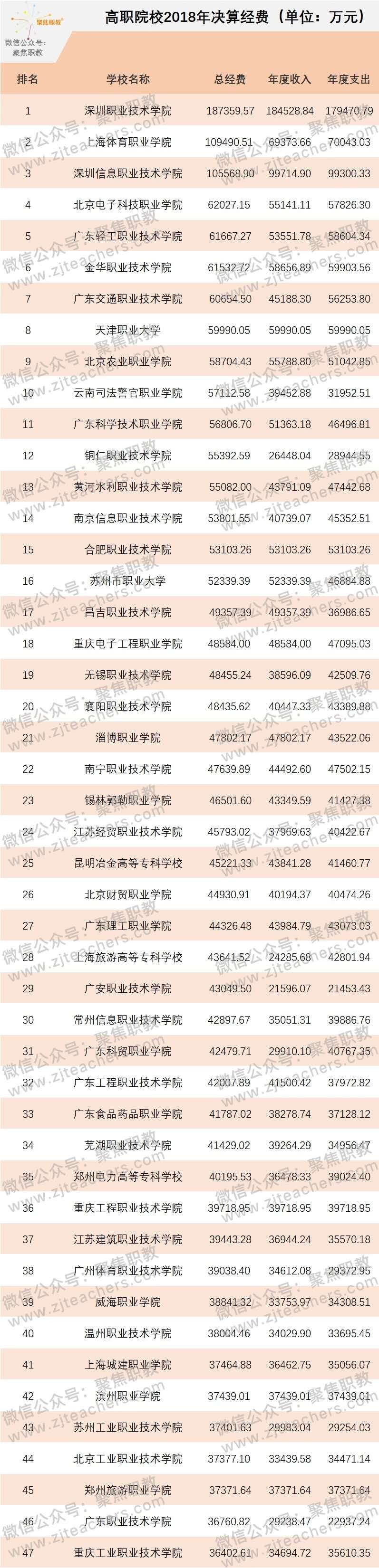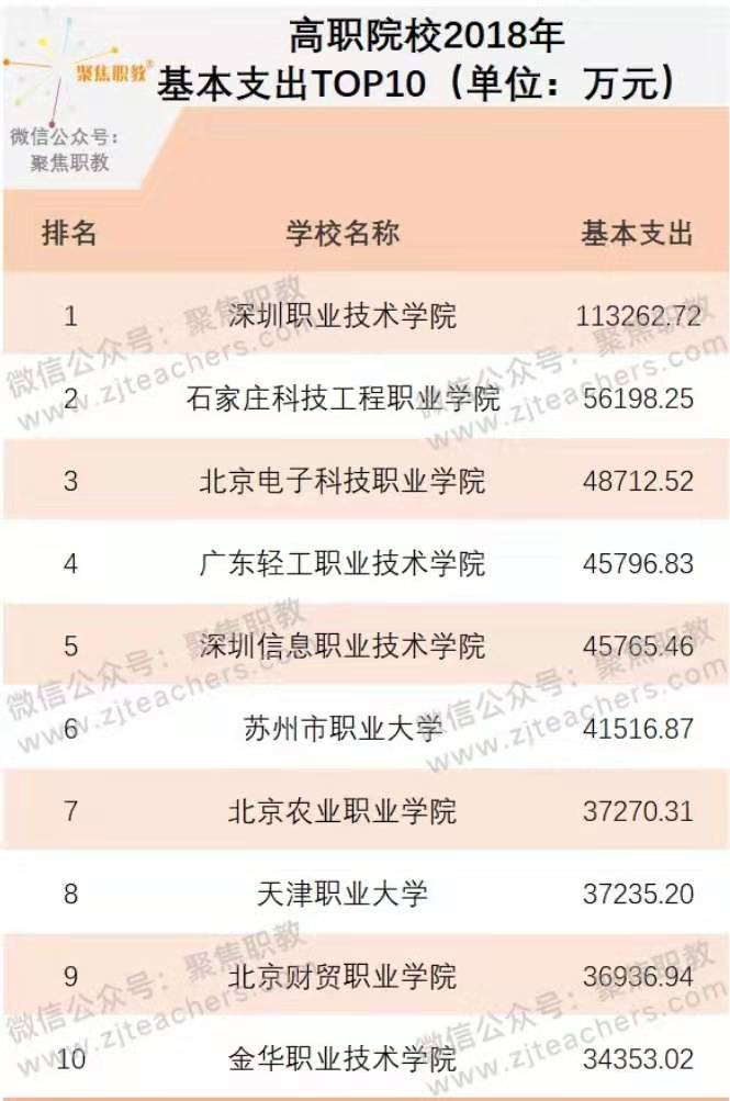 和往年一样,深圳职业技术学院、深圳信息职业技术学院、北京电子科技职业学院、广东轻工职业技术学院、金华职业技术学院、天津职业大学、北京农业职业学院仍旧稳稳地居于榜首。值得注意的是,上海体育职业学院、广东交通职业技术学院、云南司法警官职业学院异军突起,尤其上海体育职业学院,年度经费仅低于深圳职业技术学院,位列榜眼。