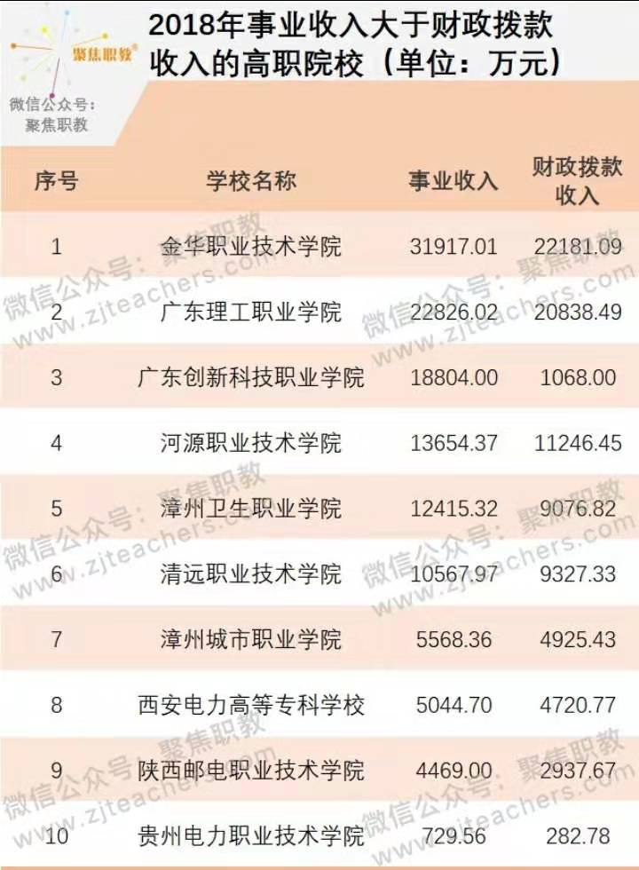 2018年,10所职业院校事业收入超过财政拨款。这说明学校教育事业欣欣向荣,科研事业成果显著,转化率高。为10所学校祝贺!