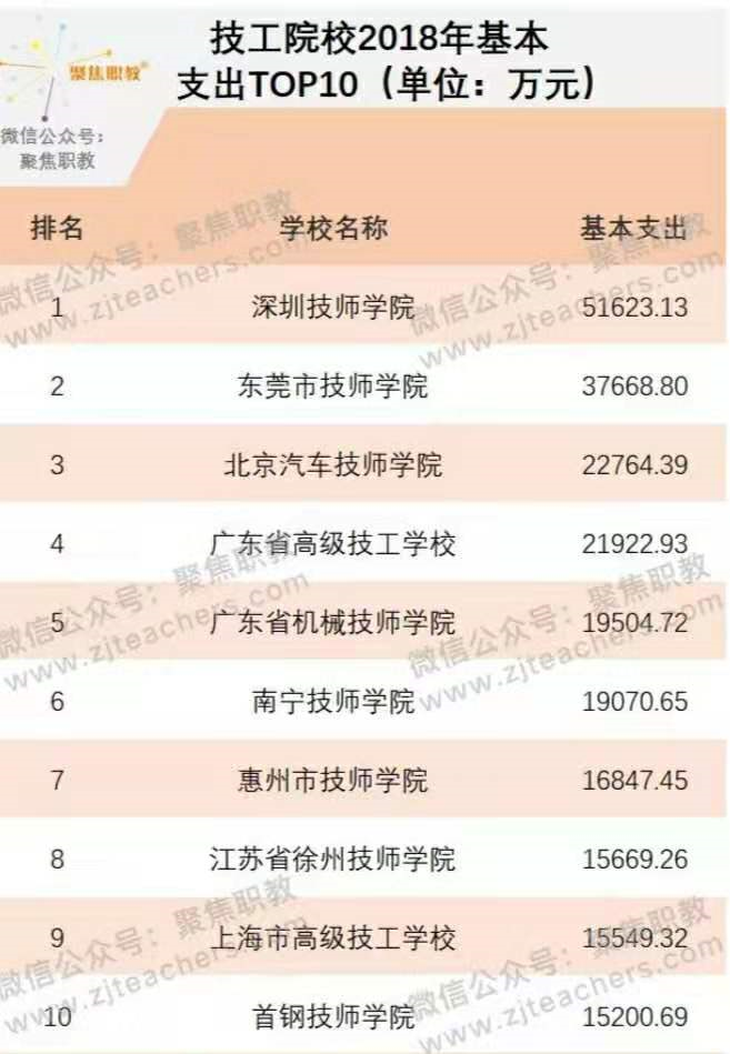 2018年,深圳技师学院在基本支出上花费21046.43万元,这个数字在高职院校基本支出排行榜上亦十分可观,可位列第41名。