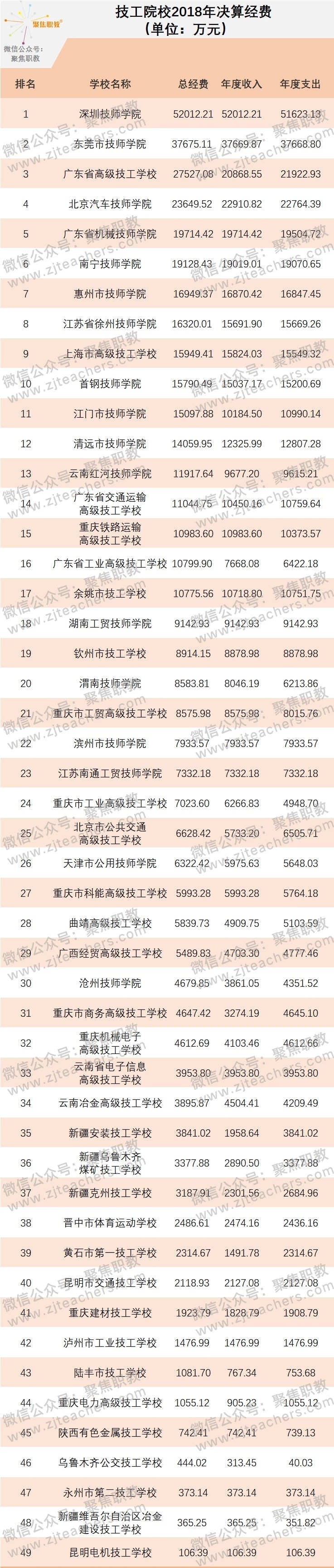 截至到10月8日,全国共有17个省份的49所技工院校公布了2018年部门决算情况。其中,1所技校突破5亿,16所技校介于1亿-4亿之间,27所技校经费处千万区间,5所技校为百万。