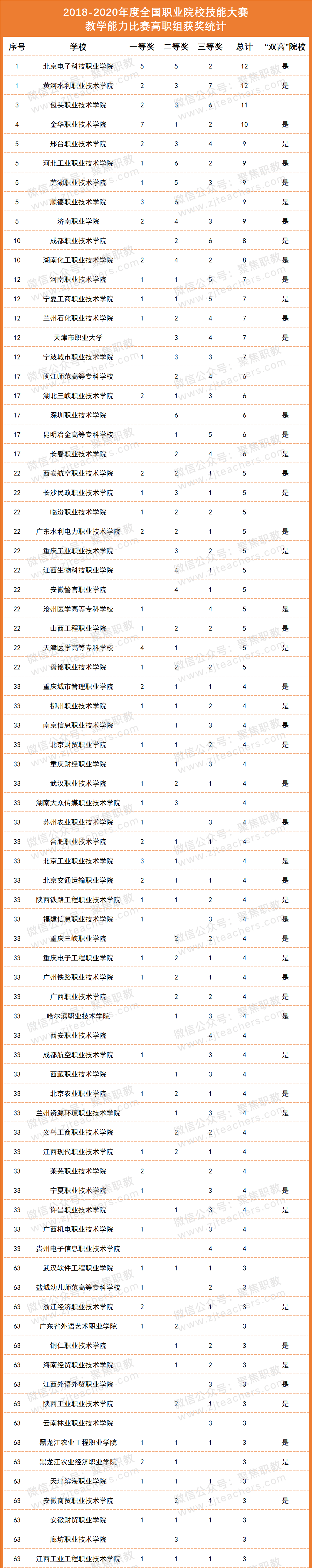 2020年度共有36所职业院校获一等奖。天津医学高等专科学校、金华职业技术学院分别获得3项一等奖;湖南机电职业技术学院和云南交通职业技术学院获得2项一等奖;黄河水利职业技术学院、邢台职业技术学院、西安航空职业技术学院、北京财贸职业学院、湖南化工职业技术学院等34所职校分别获1项一等奖。