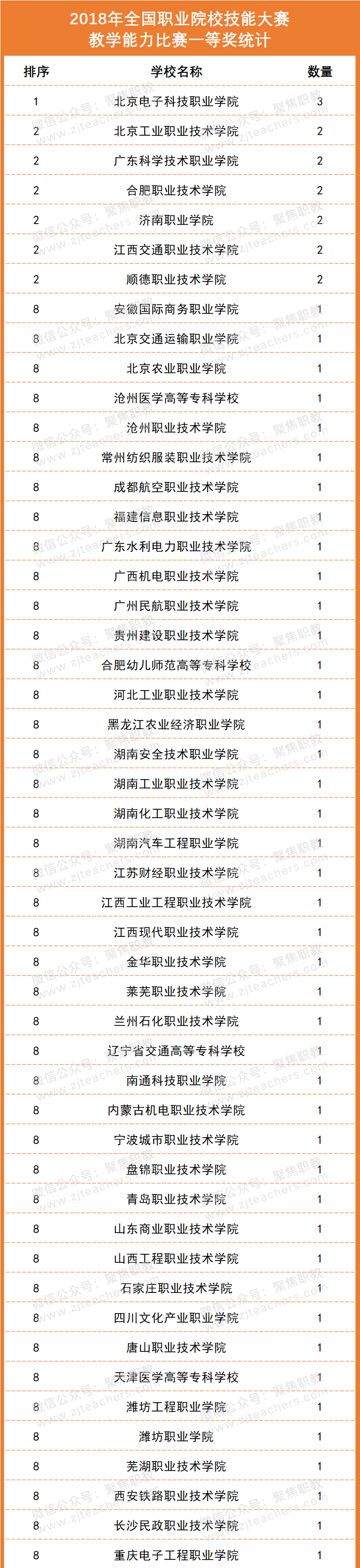 2018年度的比赛中,高职组共有50所院校获一等奖殊荣。其中,北京电子科技职业学院以获3项一等奖的好成绩位列榜首。北京工业职业技术学院、广东科学技术职业学院、合肥职业技术学院、济南职业学院、江西交通职业技术学院、顺德职业技术学院也表现不俗,各获2项一等奖。