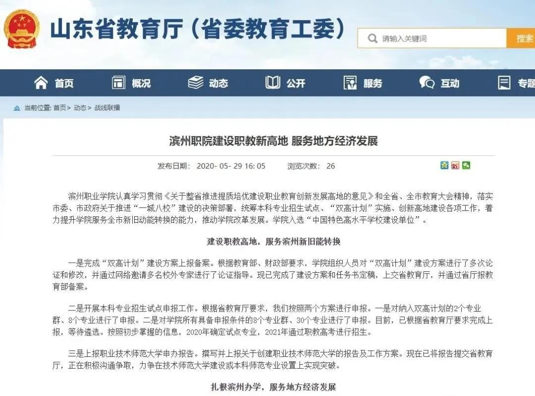 2020年5月29日,山东省教育厅官网发文《滨州职院建设职教新高地服务地方经济发展》。文中提到,滨州职业学院撰写并上报关于创建职业技术师范大学的报告及工作方案,现在已将报告提交省教育厅,正在积极沟通争取,力争在技术师范大学建设或本科师范专业设置上实现突破。