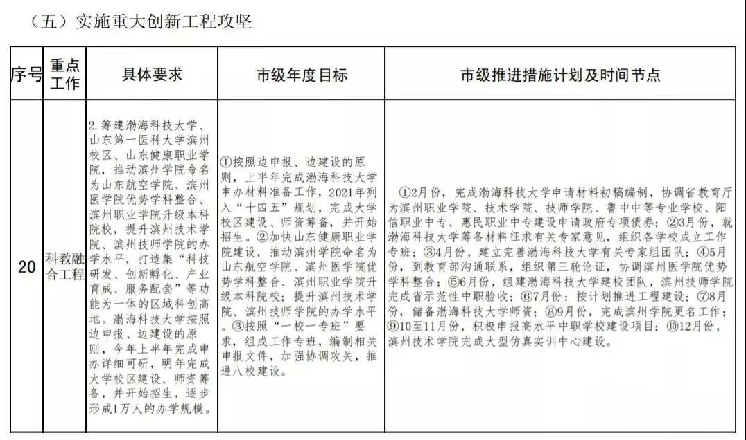 2020年3月30日,滨州市委召开全市“重点工作攻坚年”动员大会,安排部署了“7+3”改革攻坚任务。其中,滨州职业学院升级本科院校被纳入了市级年度目标。