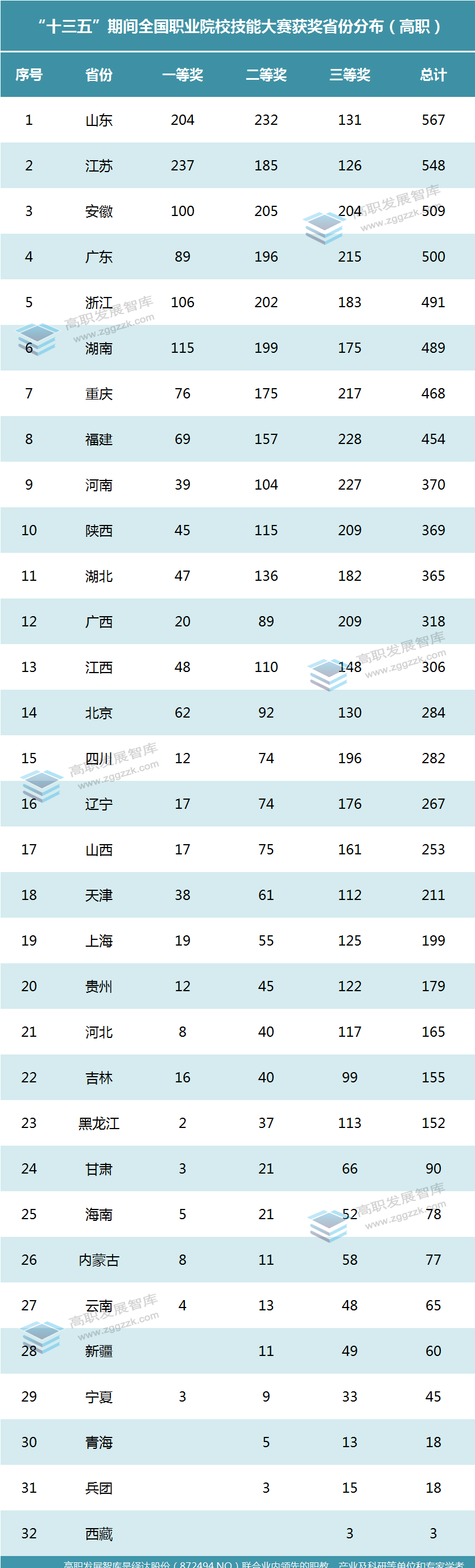“十三五”期间(2016-2020年),全国31个省(自治区、直辖市)和新疆生产建设兵团均有高职院校获奖。山东省高职院校在技能大赛中共获奖567项,获奖总数位居全国第一;江苏省高职院校共获奖548项,位居第二;安徽省高职院校共获奖509项,位居第三。各省高职院校获奖情况如下: