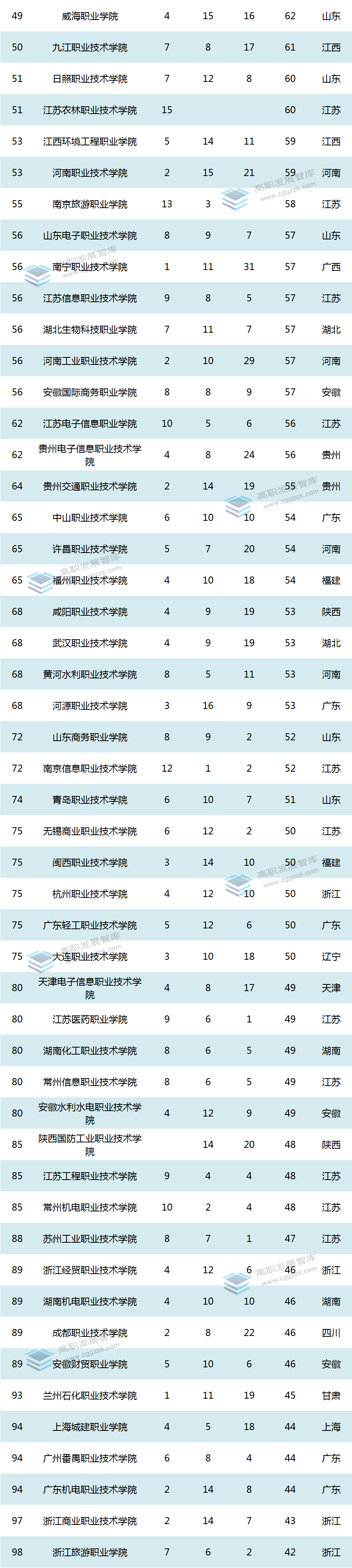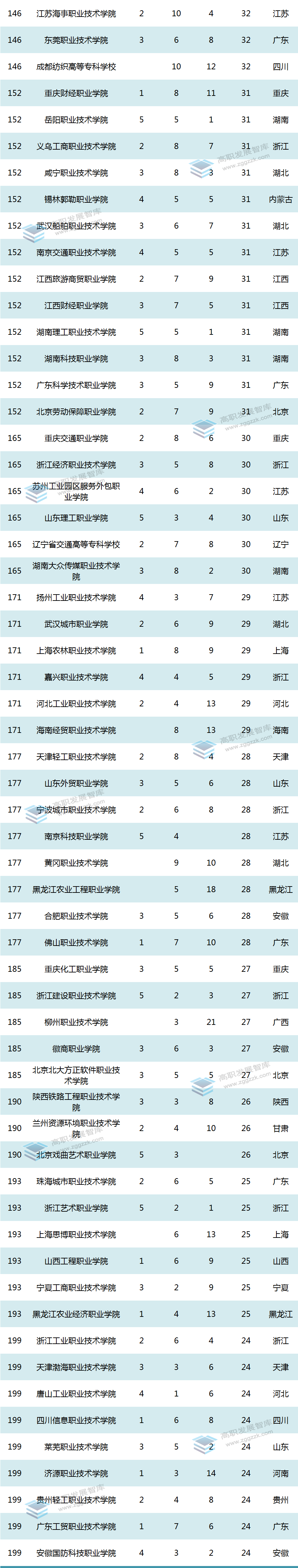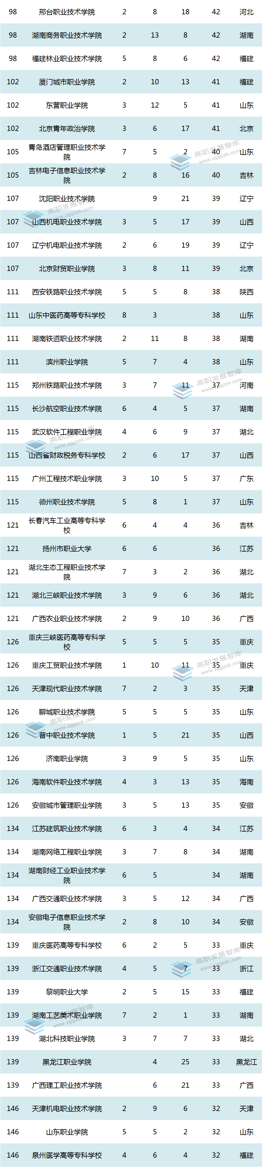 加权得分排在前十位的高职院校还有:福建船政交通职业学院、安徽工商职业学院、深圳职业技术学院、北京工业职业技术学院、重庆三峡职业学院、山东商业职业技术学院、北京信息职业技术学院。