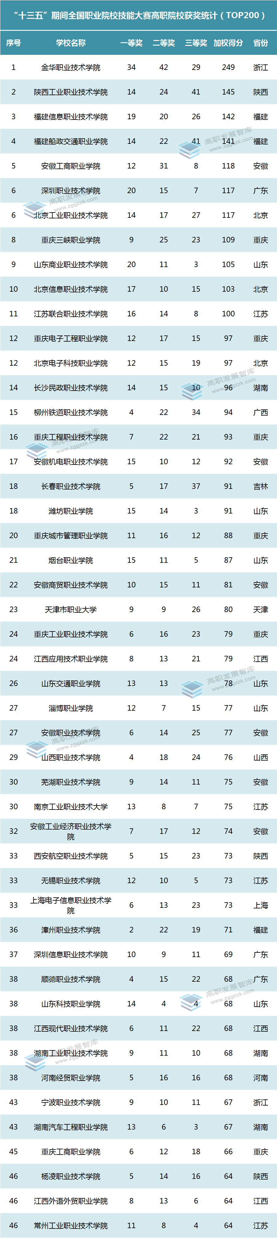 金华职业技术学院共获奖105项,包括一等奖34项,二等奖42项,三等奖29项,最终加权得分为249分,加权得分与获奖总数均位居全国第一,遥遥领先其他高职院校。陕西工业职业技术学院共获奖79项,包括一等奖14项,二等奖24项,三等奖41项,最终加权得分为145分,加权得分位居全国第二。福建信息职业技术学院共获奖65项,包括一等奖19项,二等奖20项,三等奖26项,最终加权得分为142分,加权得分位居全国第三。