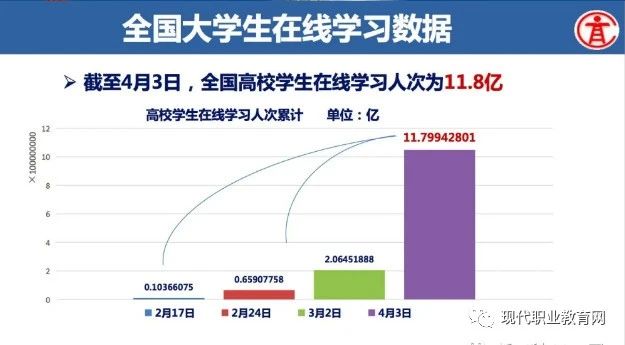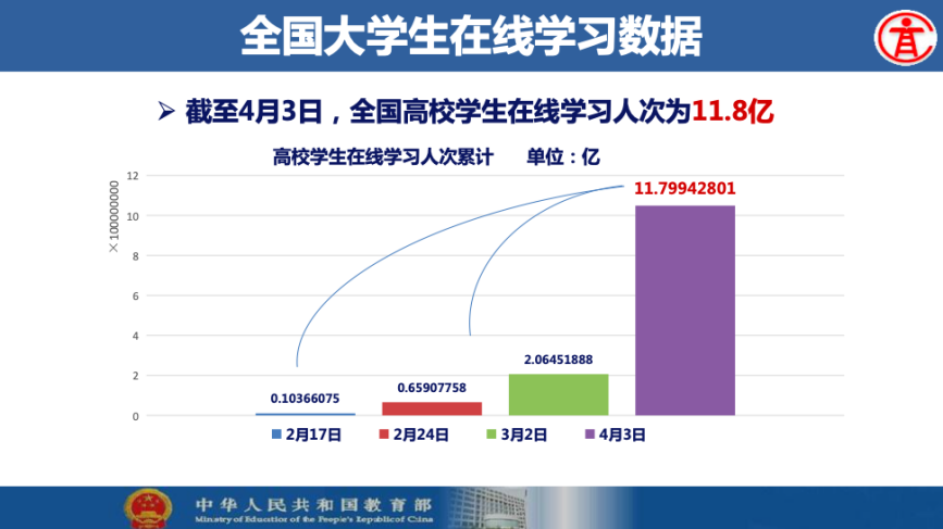 据统计,截至4月3日,全国在线开学的普通高校共计1454所,95万余名教师开设94.2万门、713.3万门次在线课程,参加在线课程学习的学生达11.8亿人次。