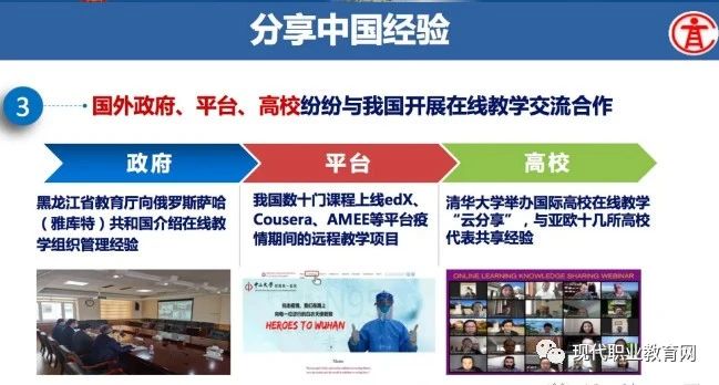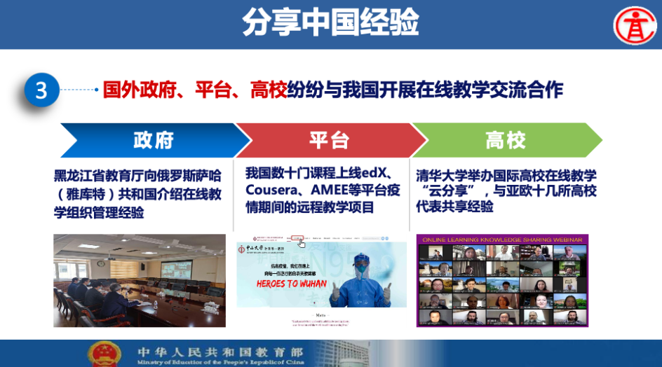 如黑龙江省教育厅向俄罗斯萨哈(雅库特)共和国介绍在线教学组织管理经验,清华大学举办国际高校在线教学“云分享”,与亚欧十几所高校代表共享经验等。