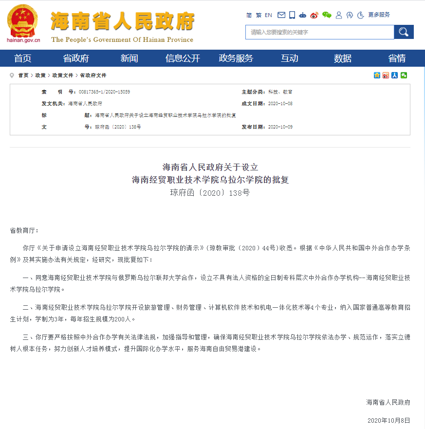 日前,海南省人民政府发布《关于设立海南经贸职业技术学院乌拉尔学院的批复琼府函〔2020〕138号》, 同意海南经贸职业技术学院与俄罗斯乌拉尔联邦大学合作,设立不具有法人资格的全日制专科层次中外合作办学机构——海南经贸职业技术学院乌拉尔学院。