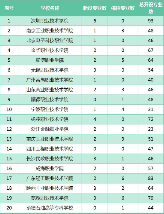近年来,就业大环境日益变化,市场供需平衡不断趋于倾斜,很多高职院校的专业设置也随之产生了变化。今天我们盘点在2018年高职高专竞争力排行榜前20的高职院校,2019年都新设了哪些专业,又停招了哪些专业?