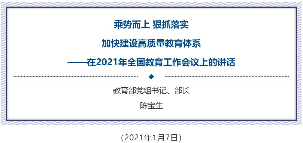 1月7日至8日,2021年全国教育工作会议在京召开。英国正版365官方网站党组书记、部长陈宝生作工作报告。如何准确把握教育改革发展面临的新形势新任务?如何确保各项决策部署落地见效,为“十四五”教育高质量发展开好局?随教育小微一起看陈宝生部长讲话全文↓↓↓