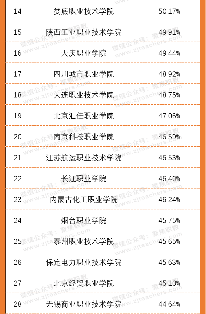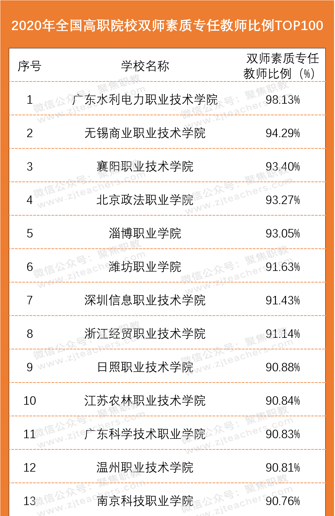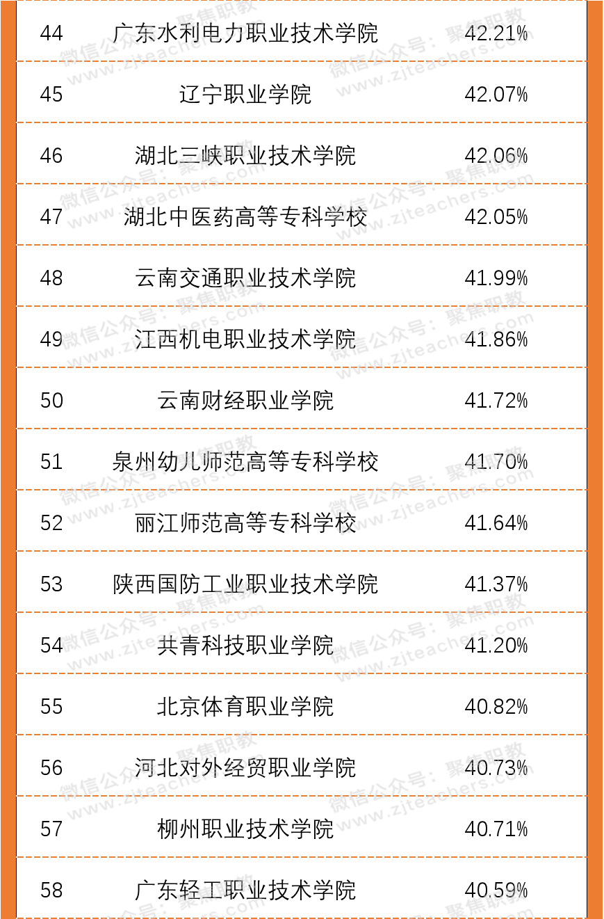 从2020年高职院校双师素质专任教师百强榜单中可以看出,广东水利电力职业技术学院以98.13%的双师素质教师领先,紧随其后的是无锡商业职业技术学院,双师教师占比94.29%,排第三的是襄阳职业技术学院,双师教师占比93.40%。