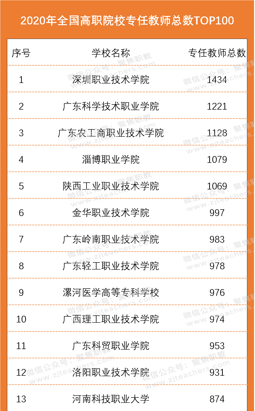 从2020年高职院校专任教师总数百强榜单中可以看出,有5所院校专任教师总数破千,分别为深圳职业技术学院(专任教师1434名)、广东科学技术职业学院(专任教师1221名)、广东农工商职业技术学院(专任教师1128名)、淄博职业学院(专任教师1079名)、陕西工业职业技术学院(专任教师1069名)。
